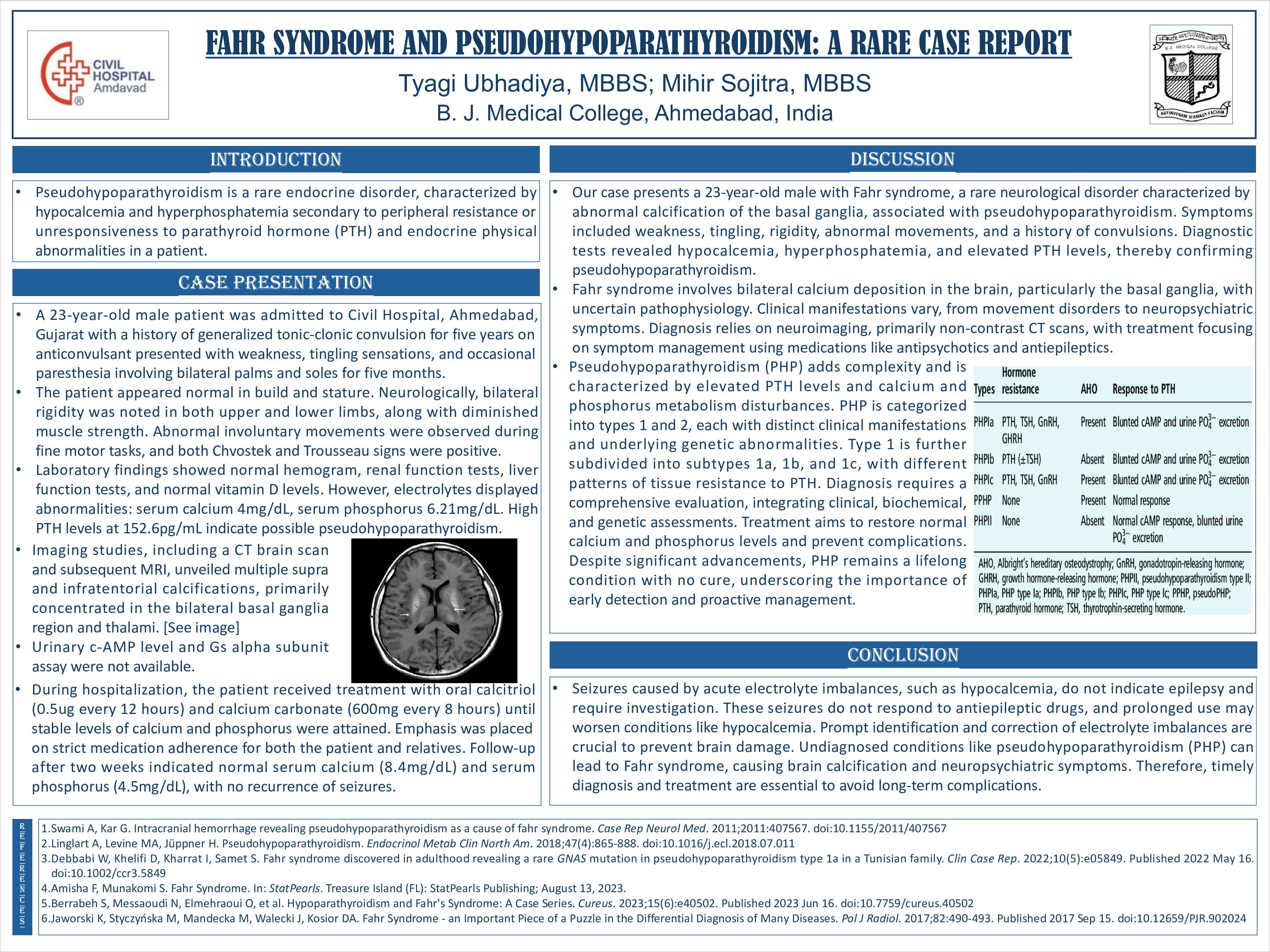 Fahr syndrome, characterized by bilateral basal ganglia calcifications, is a rare neurological condition often associated with metabolic disorders such as pseudohypoparathyroidism (PHP). We present a case report of a 23-year-old male with a history of progressive neurological symptoms including weakness, tingling, pain, rigidity, abnormal movements, and epilepsy. Diagnostic tests revealed hypocalcemia, hyperphosphatemia, and elevated parathyroid hormone levels, indicating pseudohypoparathyroidism. Brain imaging confirmed symmetric basal ganglia calcifications consistent with Fahr syndrome. The patient was treated with antiepileptic medications and calcium supplementation. This case underscores the intricate interplay between neurological and metabolic disorders, highlighting the importance of considering rare conditions in patients with complex presentations. It offers insights into the diagnosis and management of Fahr syndrome secondary to pseudohypoparathyroidism, providing valuable guidance for clinicians encountering similar cases.