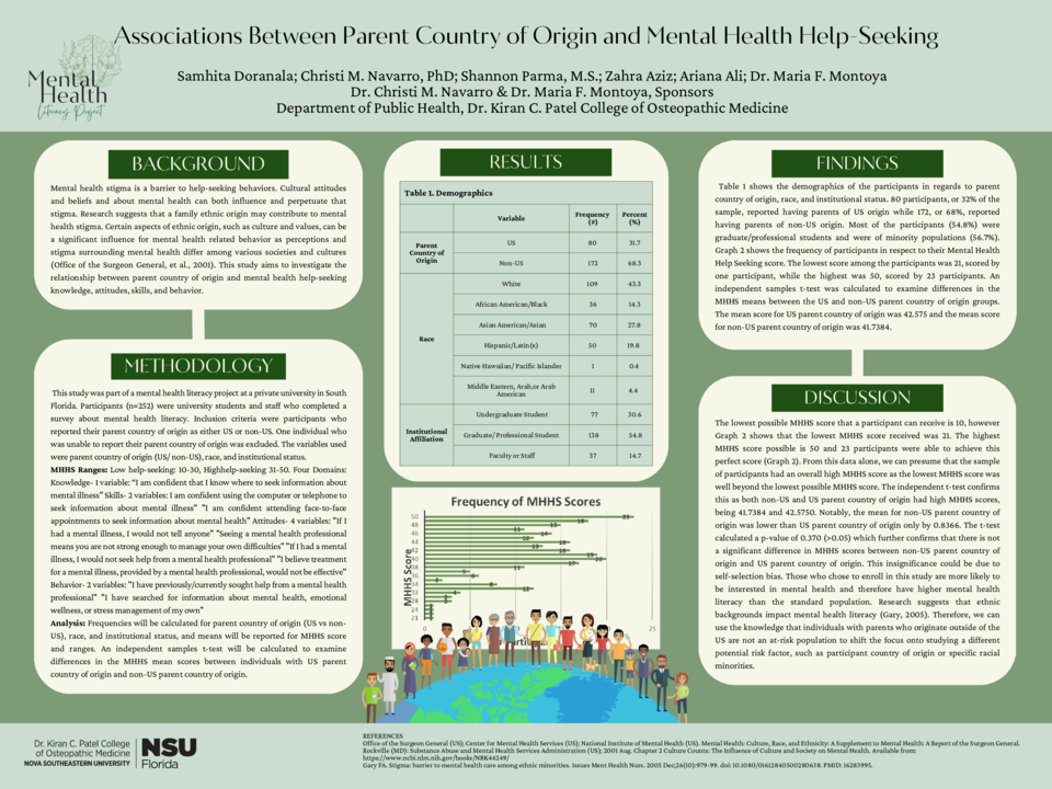 Mental health stigma is a barrier to help-seeking behaviors. Cultural attitudes and beliefs and about mental health can both influence and perpetuate that stigma. Research suggests that a family ethnic origin may contribute to mental health stigma. This study aims to investigate the relationship between parent country of origin and mental health help-seeking knowledge, attitudes, skills, and behavior.