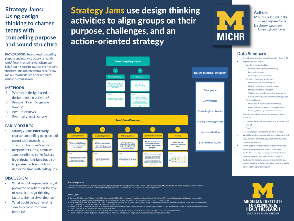 We posit that design thinking principles can fill this need (LaPensée & Doshi 2020). At the Michigan Institute for Clinical & Health Research (MICHR), we have developed workshops that include design thinking activities known as “Research Jams.” Our Ideation and Visioning Jams reliably focus and accelerate team creativity, generating excitement for working together (LaPensée et al 2021). Now, we are developing a new “flavor of Jam” known as a Strategy Jam to help teams convert their big idea into an actionable purpose, principles, and projects.