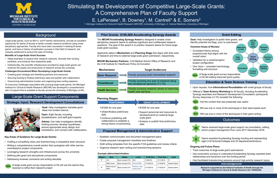 Large-scale grants, such as NIH U- and P-series mechanisms, provide an excellent opportunity for teams of faculty to tackle complex research problems using cross-disciplinary approaches. Faculty who have been successful in obtaining R-series grants, and have a history of publication success in their field of research, are uniquely positioned to pursue this type of funding. Large-scale grant success helps awardees to expand their research networks, diversify their funding portfolios, and enhance their leadership skills. Institutionally, the scientific infrastructure provided by large-scale grants can enhance the quality and productivity of research across the university. Regardless of the benefits, there are several challenges that faculty encounter when developing these applications, including creating grant strategy, overcoming administrative burden, organizing team writing sessions, and securing funding to finalize preliminary data and publish with collaborators. To encourage the pursuit of large-scale grants and the development of integrated research visions, the Michigan Institute for Clinical & Health Research (MICHR) at the University of Michigan has developed a comprehensive plan of support that is available to faculty across the university. The elements of MICHR’s support plan include: 1) strategic input on conceptualizing the grant and building the team, 2) $100,000 pilot awards, 3) administrative support, 4) proposal management, 5) grant editing, 6) educational resources and 7) team science training. In just the last year, 15 teams have utilized MICHR large-scale grant support services in contrast to the four teams per year we typically assisted prior to launching this initiative; 40 faculty attended our first team science training. We have awarded three $100,000 pilot grants, with our second cohort of 21 applications currently under review. This poster will describe the various components of the large-scale grant support plan, common themes in strategic advice, and outcomes associated with our pilot grants and broader services.