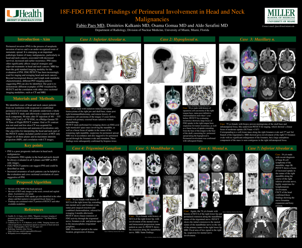 Perineural invasion (PNI) is the process of neoplastic invasion of nerves and is an under-recognized route of metastatic spread. It is emerging as an important pathologic feature of many malignancies, particularly in head and neck cancers, associated with decreased survival, increased and earlier recurrence. PNI status often significantly affects surgical strategies and adjuvant treatments in head and neck cancers. MRI has been the gold standard imaging modality for the evaluation of PNI. FDG PET/CT has been increasingly used for staging and restaging head and neck cancers. Beyond locoregional disease and lymph node metabolic characterization, different PET imaging patterns suggesting PNI can also be identified. Our goal is to demonstrate different examples of PNI visualized by PET/CT and the correlation with other cross sectional imaging modalities, such as CT and MRI.