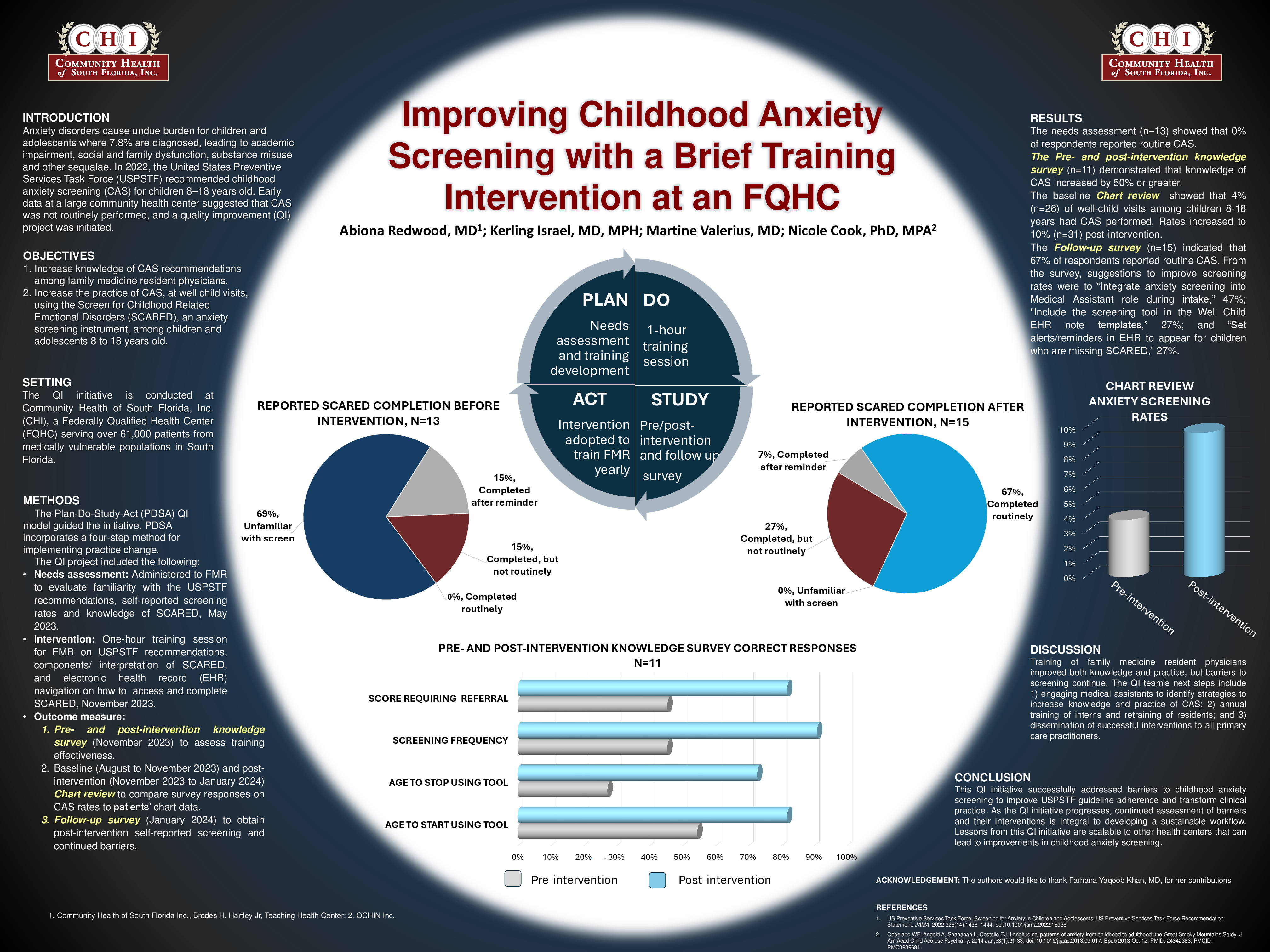 The needs assessment (n=13) indicated that 0% of respondents reported routine CAS, 36% did not know