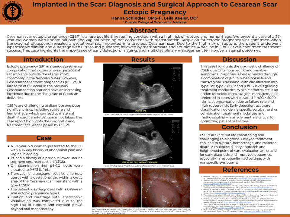 A 27-year-old woman presented to the emergency department (ED) with a 16-day history of abdominal pain and vaginal bleeding, initially believed to be her menstrual period. She had a history of one previous lower uterine segment cesarean section (LTCS). On examination, her β-hCG levels were elevated, and transvaginal ultrasound revealed an empty uterus with a gestational sac within a cystic area of the Cesarean scar. The patient was diagnosed with a Cesarean scar ectopic pregnancy. Surgical resection was recommended due to the high risk of rupture, and the patient underwent laparoscopic surgery with dilation and curettage for gestational sac removal. Postoperative management included methotrexate, antibiotics, and analgesia. A follow-up β-hCG test showed a significant decline, confirming resolution of the ectopic pregnancy. At her two-week follow-up, the patient remained asymptomatic with no further vaginal bleeding, and ultrasound imaging confirmed the absence of retained products of conception.