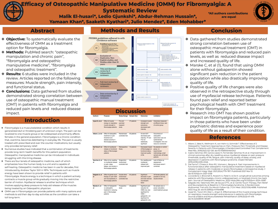 The study adhered to PRISMA guidelines and utilized Covidence software to conduct a systematic review. A comprehensive PubMed search was conducted using the following terms: "Osteopathic Manipulation AND Chronic pain," "Fibromyalgia AND osteopathic manipulative medicine," and "Fibromyalgia AND osteopathic treatment." Following the initial search, duplicates, non-English studies, and articles published more than ten years ago were excluded. Two independent reviewers then screened the titles and abstracts of the remaining studies. Eligible articles underwent a full-text review, also conducted by two independent reviewers. Lastly, data extraction was performed independently by two reviewers to ensure accuracy and minimize bias.