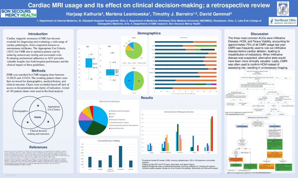 Cardiac magnetic resonance (CMR) has become essential for diagnosing and evaluating a wide range of cardiac pathologies, from congenital diseases to autoimmune infiltrates. The Appropriate Use Criteria (AUC) for CMR aim to optimize patient care by reducing unnecessary testing and associated costs. Evaluating institutional adherence to AUC provides valuable insights into both hospital performance and the clinical impact of these guidelines. A retrospective review of electronic medical records at St. Elizabeth Hospital Youngstown was conducted for patients who underwent CMR imaging between November 20, 2023, and November 15, 2024. The study assessed AUC adherence and the impact of CMR on clinical decision-making, defined as whether the diagnostic information led to a change in medical management, further imaging, or a referral to a specialist. A total of 222 patients were scanned during this period, with 87% of scans meeting class A or B AUC recommendations and 55% experiencing some change in medical management. The most common reason for requesting CMR was to rule out restrictive (infiltrative) cardiomyopathy (23%), with cardiac amyloidosis as the primary differential diagnosis. Tissue viability assessments and hypertrophic cardiomyopathy (HCM) were the second and third most common indications. Notably, none of the patients suspected of cardiac amyloidosis were diagnosed, resulting in no change in medical management. Overall, our findings highlight commendable adherence to AUC for CMR at our institution, with clinical decision-making influenced by approximately half of the imaging results. However, further diagnostic advancements may be needed to improve the identification of conditions such as cardiac amyloidosis.