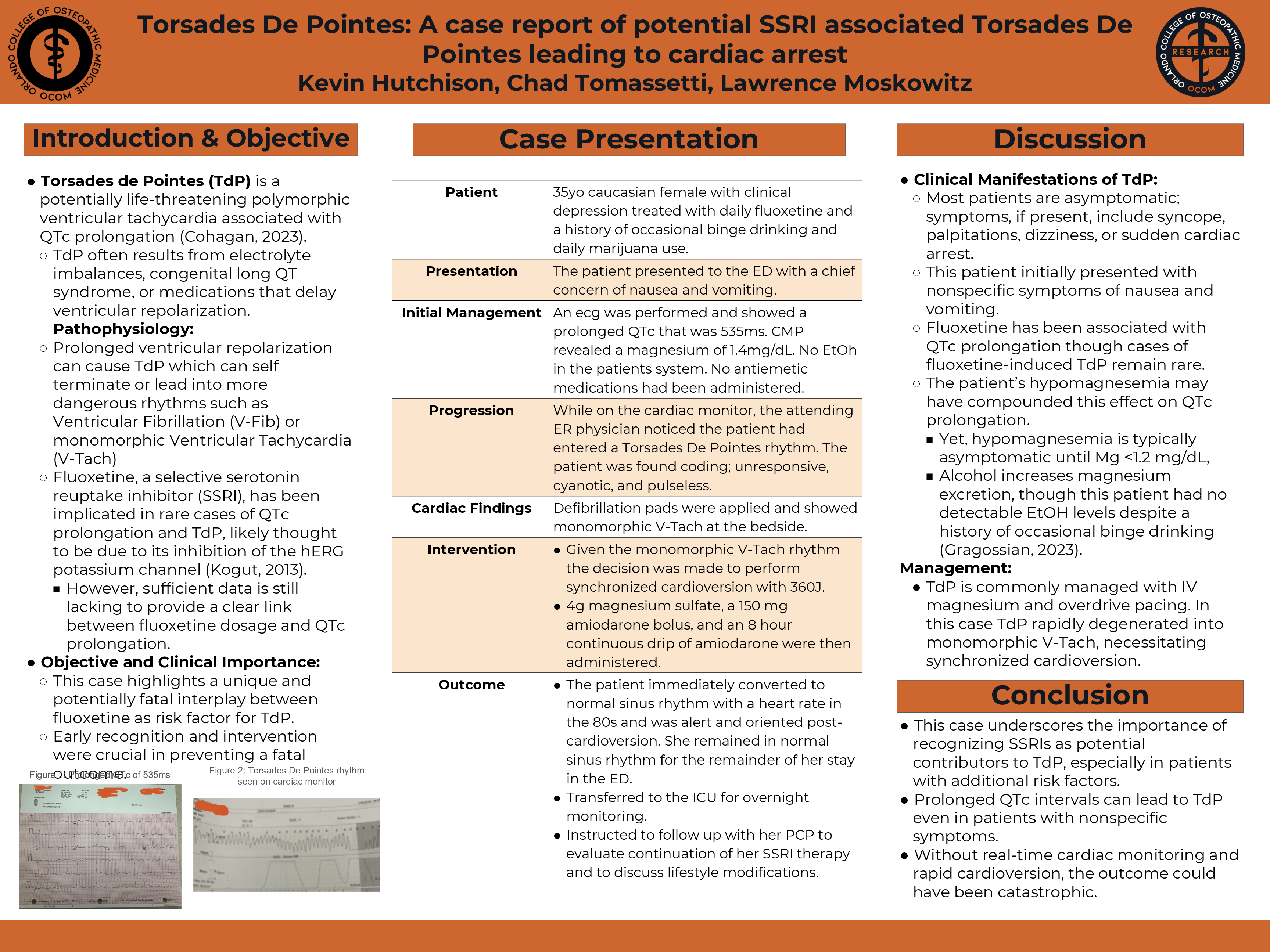A 35-year-old female with depression on daily fluoxetine, a history of binge drinking, and daily marijuana use presented to the ED with nausea and vomiting. Initial ECG revealed a QTc of 535 ms; serum magnesium was 1.4 mg/dL. While under observation, the patient developed TdP, followed by unresponsiveness and monomorphic V-Tach. Synchronized cardioversion (360J), IV magnesium sulfate (4g), and amiodarone (150 mg bolus + drip) were administered. The patient returned to sinus rhythm and remained stable. She was transferred to the ICU and advised to follow up regarding SSRI use and lifestyle changes.