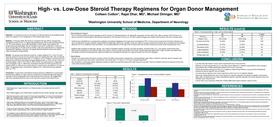 Methods: We analyzed 132 consecutive brain-dead organ donors between 8/2008 and 9/2009, including 60 patients treated prior to the protocol change (high-dose group) and 72 treated after (low-dose group). Change in PO2, change in glucose, final insulin requirements, final pressor requirements, and organ yield were extracted from a prospectively collected MTS database.