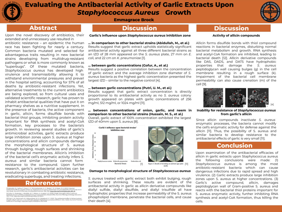 Due to overuse of the novel antibiotics, rapid accumulation of favored mutations is responsible for the high virulence and transmissibility of superbugs. The most severe antibiotic-resistant infections contract in the hospital setting, causing over 2.8 million cases and more than 35,000 deaths in the US each year [2]. Methicillin-resistant Staphylococcus aureus (MRSA) is identified as a very prevalent strain of S. aureus that has acquired resistance to all beta-lactam antibiotics like penicillins, cephalosporins, carbapenems, and monobactams [3]. MRSA and other virulent bacteria have evolved to form beta-lactamases – enzymes that deactivate the beta-lactam ring of the antibiotic in order to develop resistance [3]. The first known medicinal uses of garlic were practiced more than 4000 years ago in traditional Chinese medicine and centuries later in Egyptian medicine both for ”flu-like” symptoms. Allicin, a major organosulfur compound in garlic, is the component responsible for garlic’s antimicrobial activities. When a garlic clove is crushed, the two compounds alliin and alliinase combine to form allicin [6]. In this review, we evaluate the antibacterial activity of garlic extracts upon Staphylococcus aureus bacterial growth. Factors to be discussed are garlic’s influence upon the inhibition zone of S. aureus, allicin activity, garlic’s effects onto the morphological structure of S. aureus, and the inability of S. aureus to develop resistance to garlic’s active components.