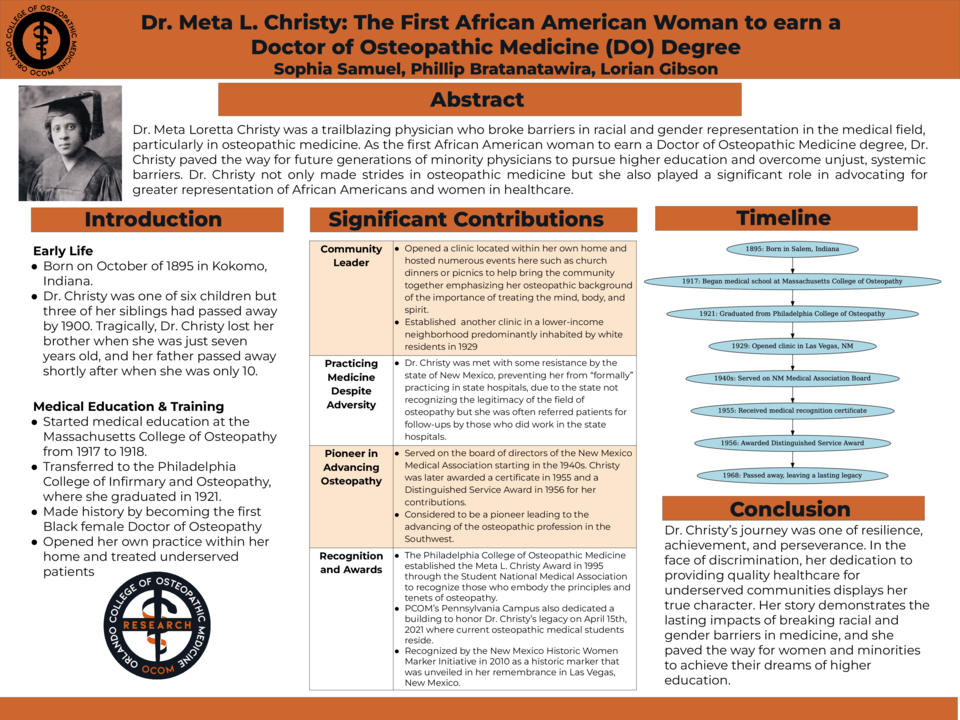 Dr. Meta Loretta Christy was a trailblazing physician who broke barriers in racial and gender representation in the medical field, particularly in osteopathic medicine. As the first African American woman to earn a Doctor of Osteopathic Medicine degree, Dr. Christy paved the way for future generations of minority physicians to pursue higher education and overcome unjust, systemic barriers. Dr. Christy not only made strides in osteopathic medicine but she also played a significant role in advocating for greater representation of African Americans and women in healthcare.