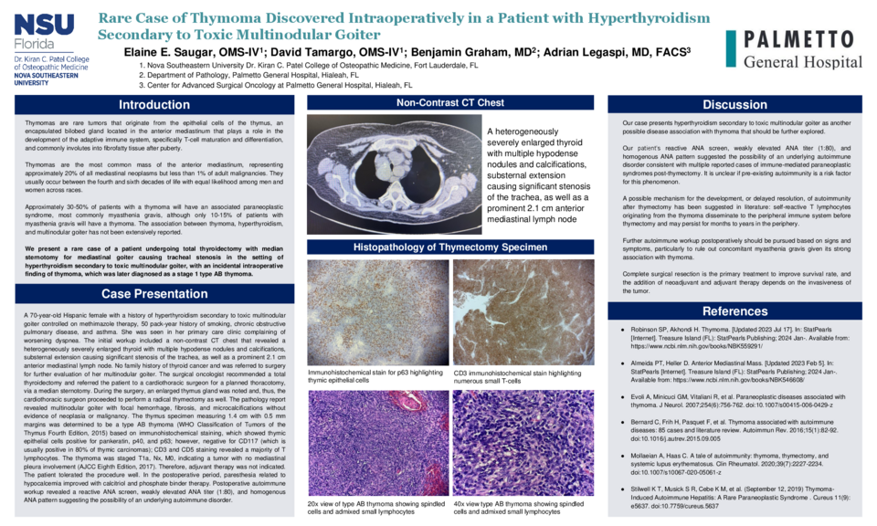 A 70-year-old Hispanic female with a history of hyperthyroidism secondary to toxic multinodular goiter controlled on methimazole therapy, 50 pack-year history of smoking, chronic obstructive pulmonary disease, and asthma. She was seen in her primary care clinic complaining of worsening dyspnea. The initial workup included a non-contrast CT chest that revealed a heterogeneously severely enlarged thyroid with multiple hypodense nodules and calcifications, substernal extension causing significant stenosis of the trachea, as well as a prominent 2.1 cm anterior mediastinal lymph node. No family history of thyroid cancer and was referred to surgery for further evaluation of her multinodular goiter. The surgical oncologist recommended a total thyroidectomy and referred the patient to a cardiothoracic surgeon for a planned thoracotomy, via a median sternotomy. During the surgery, an enlarged thymus gland was noted and, thus, the cardiothoracic surgeon proceeded to perform a radical thymectomy as well. The pathology report revealed multinodular goiter with focal hemorrhage, fibrosis, and microcalcifications without evidence of neoplasia or malignancy. The thymus specimen measuring 1.4 cm with 0.5 mm margins was determined to be a type AB thymoma (WHO Classification of Tumors of the Thymus Fourth Edition, 2015) based on immunohistochemical staining, which showed thymic epithelial cells positive for pankeratin, p40, and p63; however, negative for CD117 (which is usually positive in 80% of thymic carcinomas); CD3 and CD5 staining revealed a majority of T lymphocytes. The thymoma was staged T1a, Nx, M0, indicating a tumor with no mediastinal pleura involvement (AJCC Eighth Edition, 2017). Therefore, adjuvant therapy was not indicated. The patient tolerated the procedure well. In the postoperative period, paresthesia related to hypocalcemia improved with calcitriol and phosphate binder therapy. Postoperative autoimmune workup revealed a reactive ANA screen, weakly elevated ANA titer (1:80), and homogenous ANA pattern suggesting the possibility of an underlying autoimmune disorder.