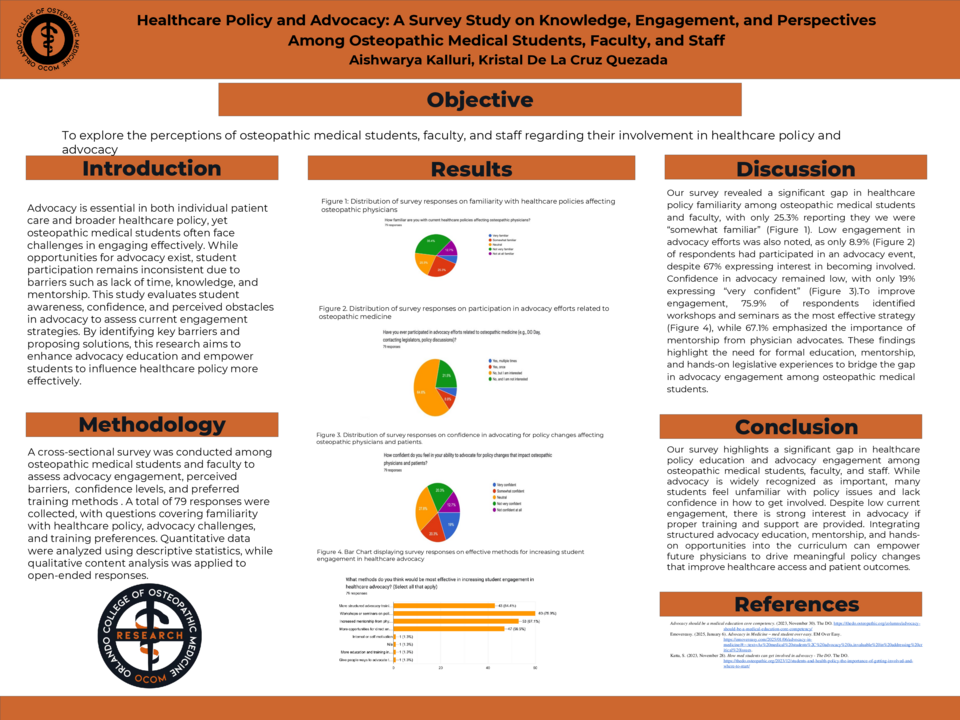 A cross-sectional survey was conducted among osteopathic medical students and faculty to assess advocacy engagement, perceived barriers, confidence levels, and preferred training methods. A total of 79 responses were collected with questions covering familiarity with healthcare policy, advocacy challenges, and training preferences. Quantitative data were analyzed using descriptive statistics, while qualitative content analysis was applied to open-ended responses.