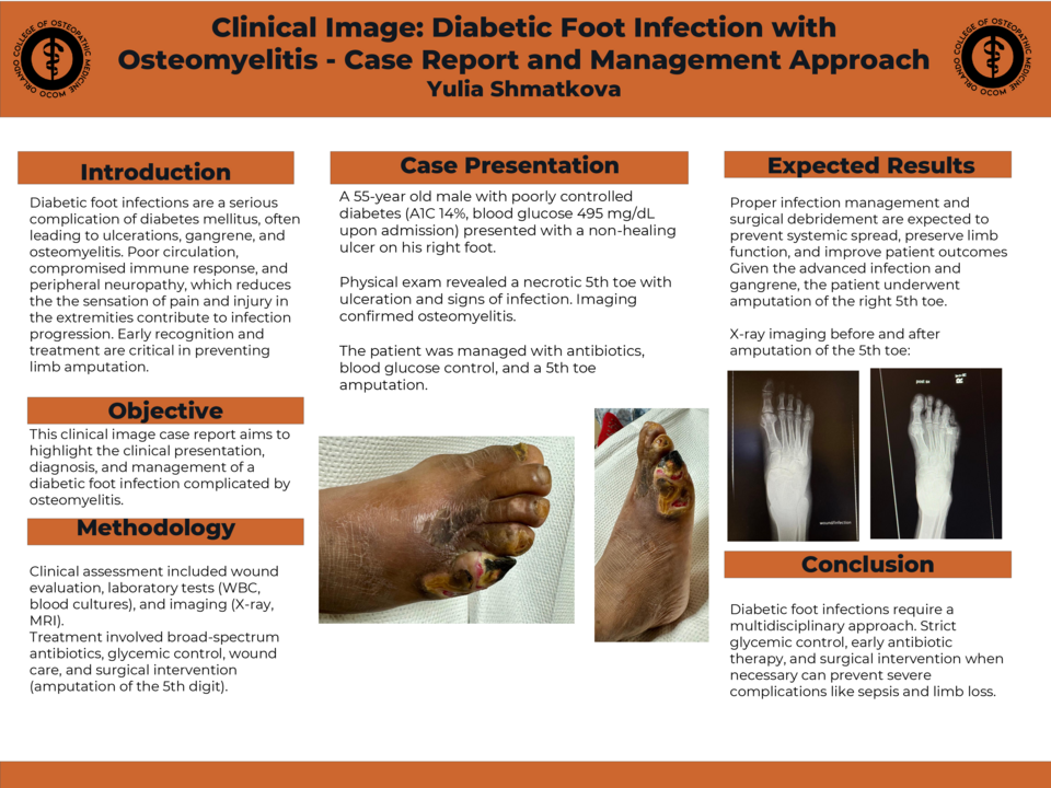 A 55-year old male with poorly controlled diabetes (A1C 14%, blood glucose 495 mg/dL upon admission) presented with a non-healing ulcer on his right foot. Physical exam revealed a necrotic 5th toe with ulceration and signs of infection. Imaging confirmed osteomyelitis. The patient was managed with antibiotics, blood glucose contorl, and a 5th toe amputation.