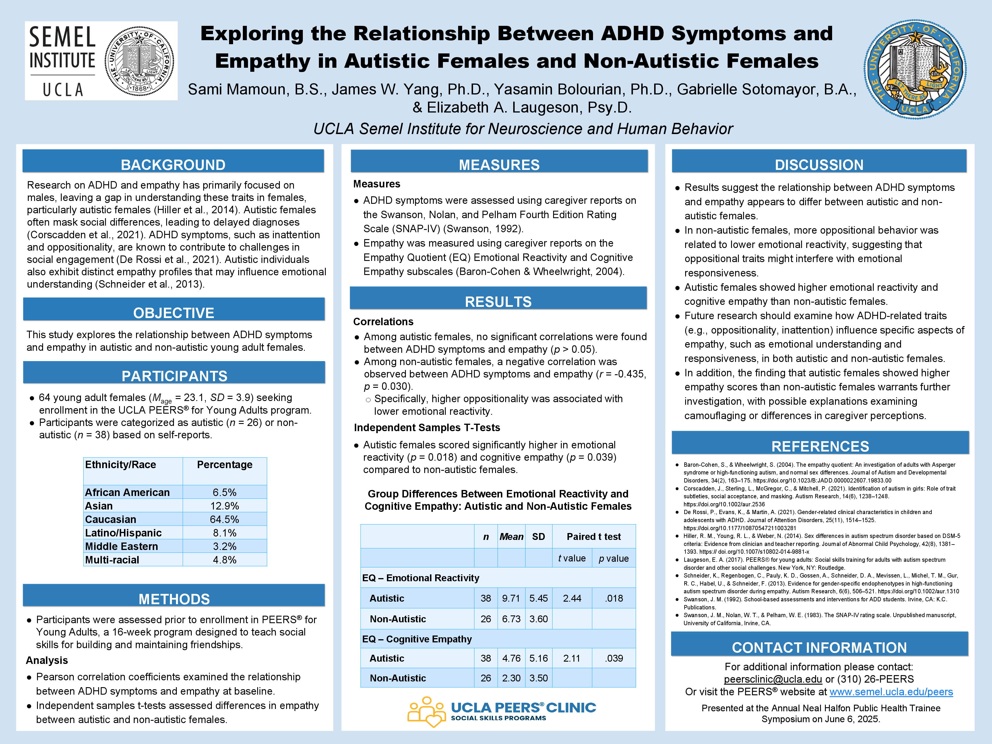 Methods: Participants included 64 young adult females (Mage = 23.1, SD = 3.9) enrolled in the UCLA PEERS® for Young Adults program, an evidence-based social skills intervention for neurodivergent adults (Laugeson et al., 2015). Participants were categorized as autistic (n = 26) or non-autistic (n = 38) based on self-reports. ADHD symptoms were assessed using the caregiver-reported Swanson, Nolan, and Pelham Rating Scale (SNAP-IV; Swanson, 1992), while empathy was measured using the caregiver-reported emotional reactivity and cognitive empathy subscales of the Empathy Quotient (EQ; Baron-Cohen & Wheelwright, 2004). Pearson correlation coefficients examined the relationship between ADHD symptoms and empathy, and independent sample t-tests assessed differences between groups.