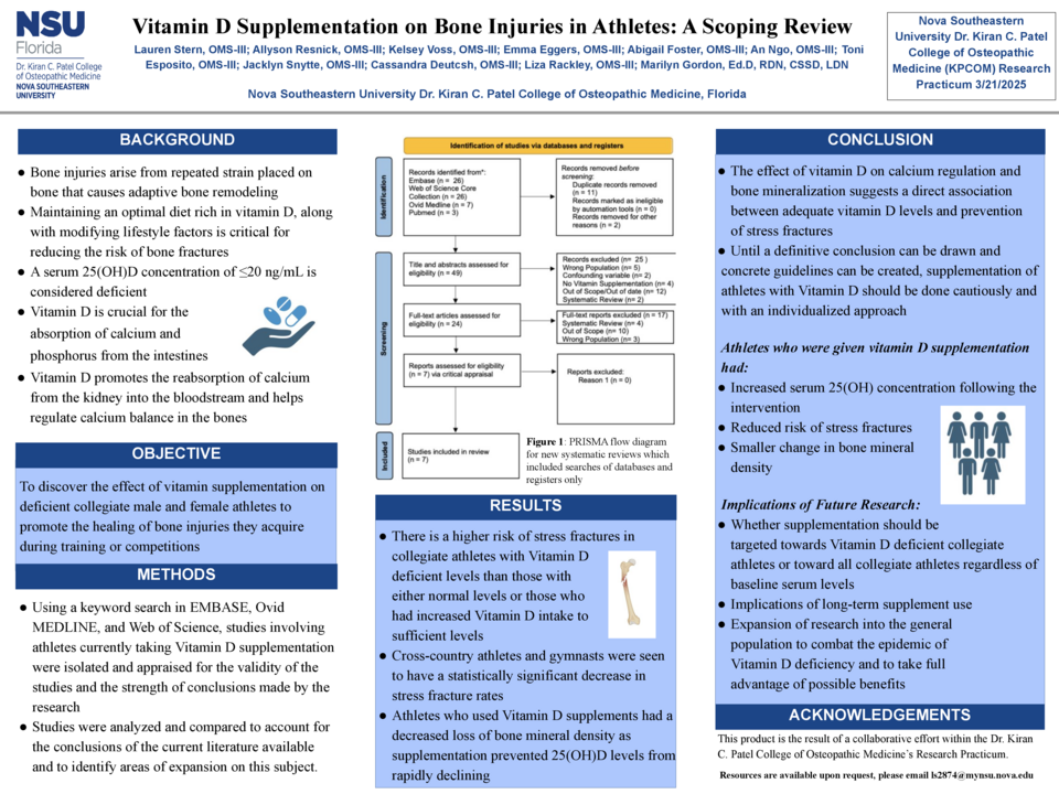 Athletes have an increased risk for bone injuries, mainly stress fractures, due to intensive training regimens. While these injuries can be associated with long and painful recovery times, they have been shown to be supported by supplementation of 25-hydroxyvitamin-D (vitamin D). Vitamin D has been shown to regulate calcium levels, which is associated with the promotion and maintenance of healthy bones, and could play a role in healthy bone remodeling. The objective of this scoping review is to gain insight into the effects of vitamin D supplementation on bone recovery in collegiate male and female, especially among athletes who have suffered stress fractures during training or competition. Using a keyword search in EMBASE, Ovid MEDLINE, and Web of Science, studies involving athletes currently taking Vitamin D supplementation were isolated and assessed for the validity and the strength of conclusions. The studies were analyzed and compared, taking into account the conclusions within the currently available literature and to identify areas of future study. Results revealed a higher risk of stress fractures among collegiate athletes with Vitamin D deficient levels as compared with those with either normal levels or those who had increased Vitamin D intake to sufficient levels. Amongst high-risk sports, such as basketball, cross country, and swimming, cross-country athletes experienced a statistically significant decrease in stress fracture rates following Vitamin D supplementation compared to athletes with deficient vitamin levels. In addition, athletes who used Vitamin D supplementation during their training season experienced decreased loss of bone mineral density, likely attributable to the prevention of vitamin D levels from rapidly declining. This scoping review highlighted the benefits of vitamin D supplementation among collegiate male and female athletes, especially those who have suffered stress fractures during training or competition. Based on these findings, further investigation into whether supplementation should be targeted towards Vitamin D deficient collegiate athletes or toward all collegiate athletes regardless of baseline serum levels as well as a need to consider the implications of long-term supplement use is warranted.