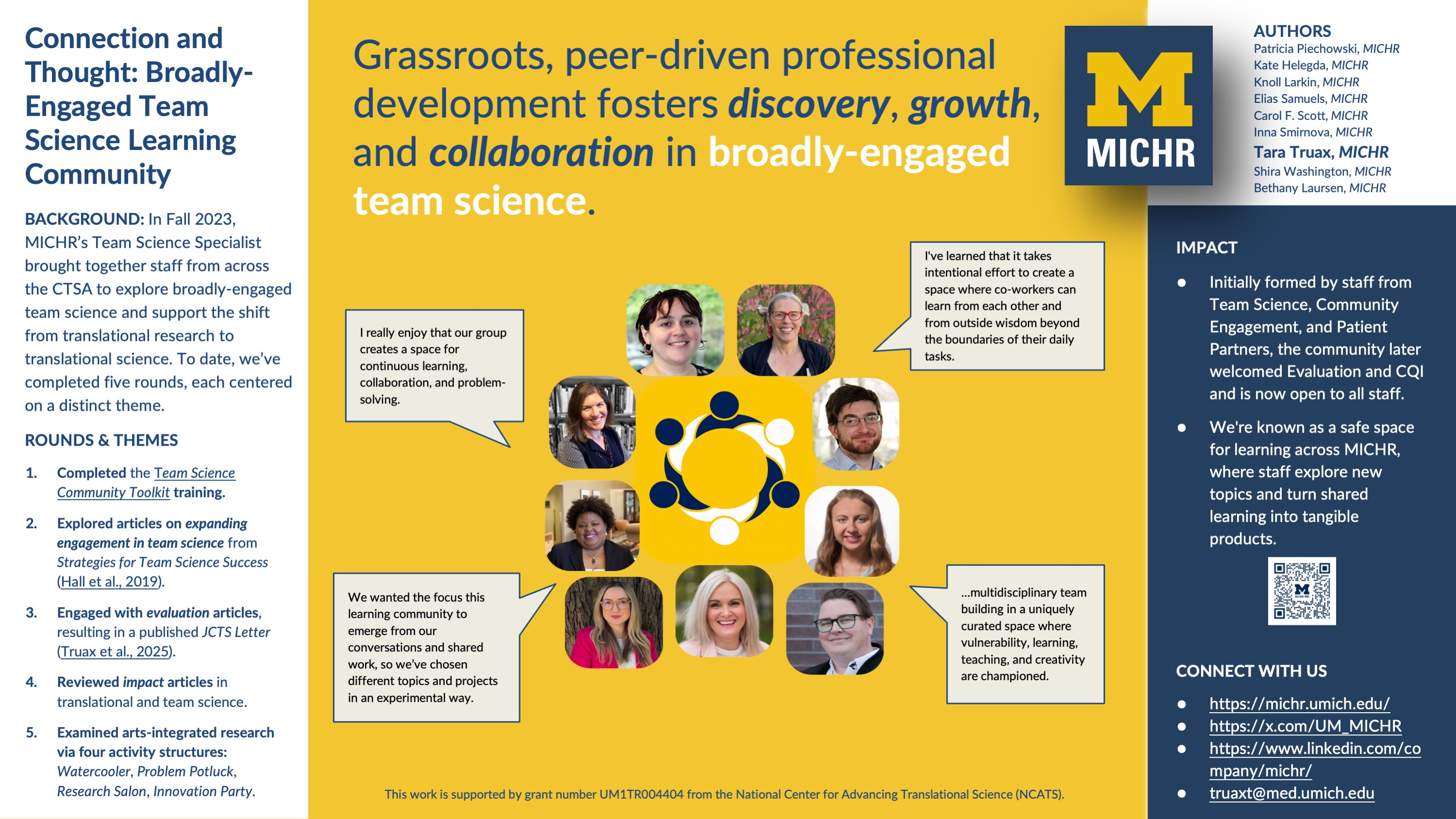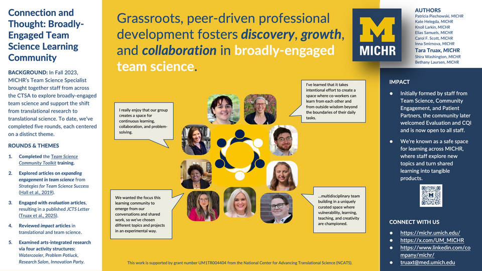 Over a year ago, the team science specialist at the Michigan Institute for Clinical and Health Research (MICHR), the Clinical & Translational Science Award (CTSA) of the state of Michigan, brought together a diverse group of individuals from various cores to meet weekly and consider topics in broadly engaged team science, especially the inclusion of community partners. Each of the four learning communities implemented thus far has had a different focus and slightly different members.