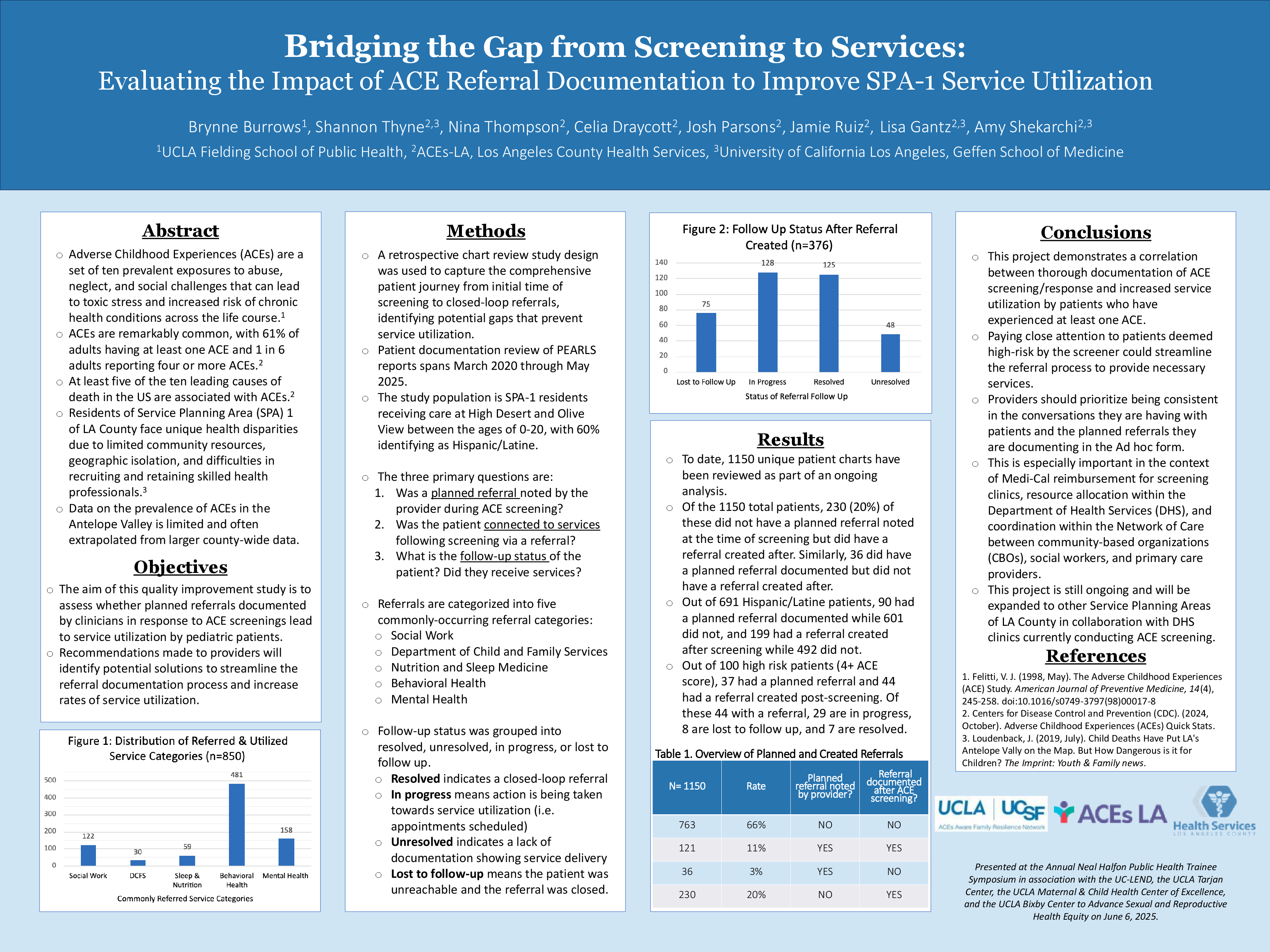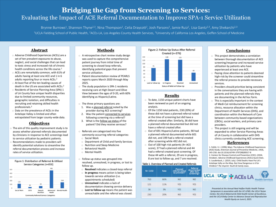 The aim of this quality improvement study is to assess whether interventions documented by clinicians in response to ACE screenings lead to service utilization by pediatric patients. A retrospective chart review study design captures the comprehensive patient journey from initial time of screening to closed-loop referrals, identifying potential gaps that prevent service utilization. Patient documentation review of PEARLS reports spans March 2020 through May 2024. The study population is SPA-1 residents receiving care at High Desert and Olive View between the ages of 0-20, with 60% identifying as Hispanic/Latine. The three primary questions are: was a planned referral noted during screening, was the patient connected to services following screening, and what is the follow up status of the patient. Referrals are categorized into five subheadings: mental health, department of children and family services (DCFS), nutrition/sleep, and behavioral health. Follow up status was grouped into resolved, unresolved, in progress, or lost to follow up.