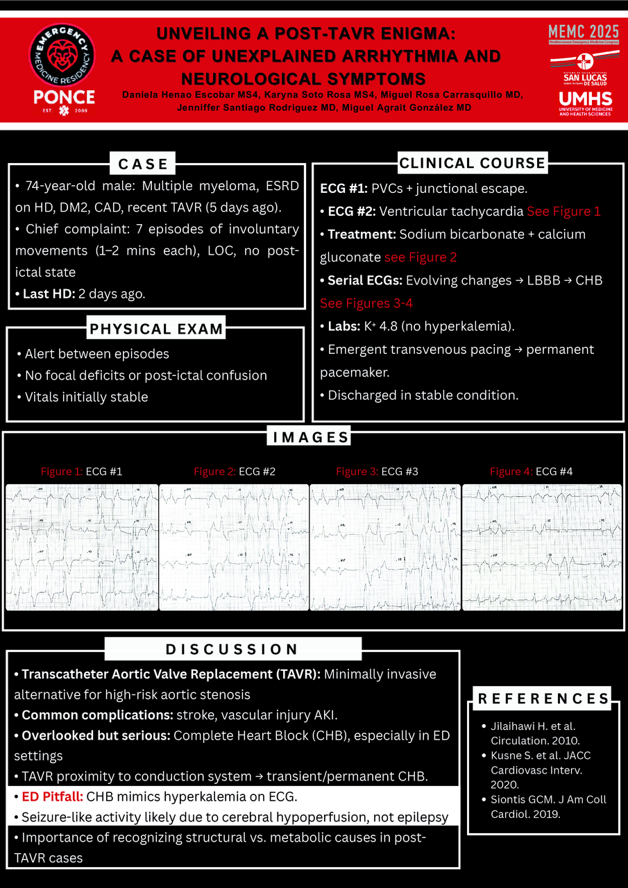 TAVR is a minimally invasive technique for management of high risk aortic stenosis. Common complications include stroke, vascular injury, and acute kidney injury, among others. Frequently overlooked complications include complete heart block due to the close proximity of the repair and the heart's conduction system. Recognizing the difference between structural and metabolic derangements and their findings on EKG is a critical skill for EM physicians who managing this condition.