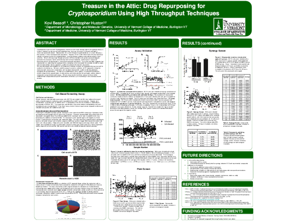 We have developed and validated our HTS platform to identify inhibitors of Cryptosporidium parvum and to conduct in vitro follow-up. We have used this assay to screen a collection of 726 approved or drug-like molecules both alone and in combination with low dose nitazoxanide in order to identify potentially synergistic drug combinations. Through minor modifications of our system, it is possible to determine whether drugs exhibit parasite-static or cidal activity, and to formally test for synergistic activity between compounds using checkerboard assays. We are using results from these assays to help prioritize validated lead compounds/compound combinations for follow up in vivo testing in immunocompromised animals.