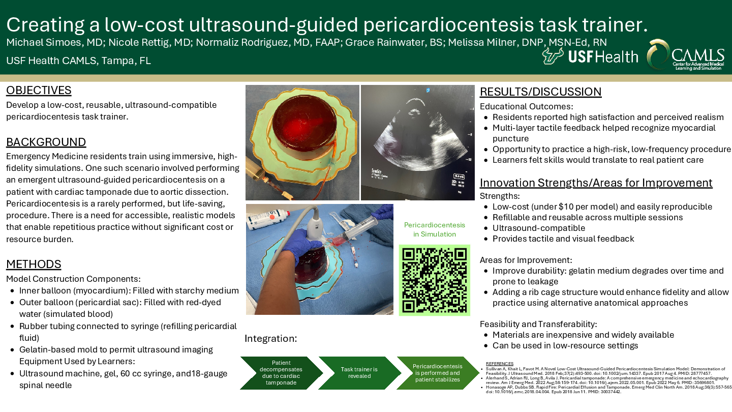 During the debriefing session and evaluation surveys, residents gave positive feedback and appreciated the realism provided by having various media layers to provide feedback if the needle progressed into the myocardium. They found the opportunity to perform this procedure very helpful as this is a high-stakes, infrequent procedure, and they felt that this skill performed on this model will translate to a real patient encounter.