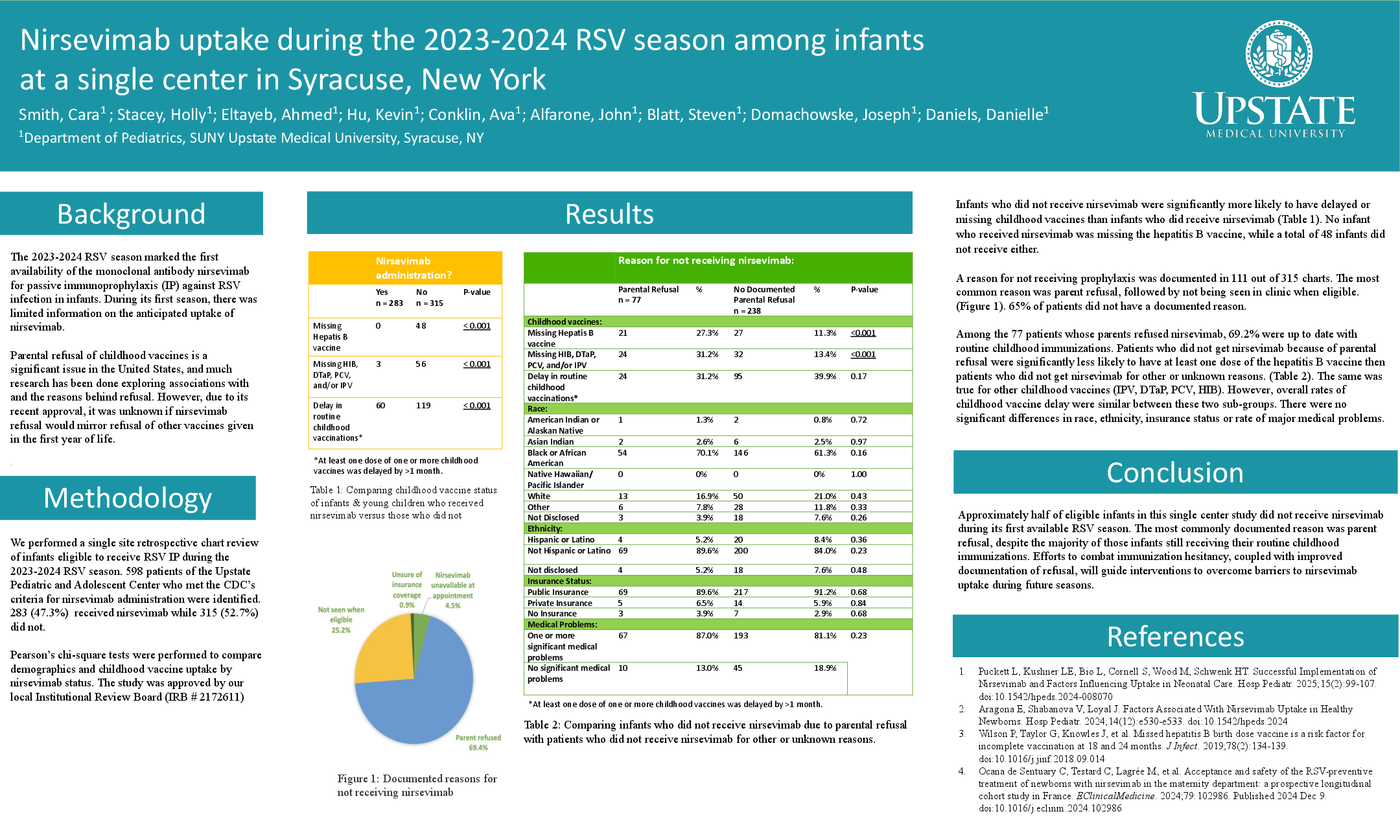 Design/Methods: We performed a retrospective chart review of infants eligible to receive RSV immunoprophylaxis during the 2023-2024 RSV season. Pearson’s chi-square tests were performed to compare demographics and childhood vaccine uptake by nirsevimab status.