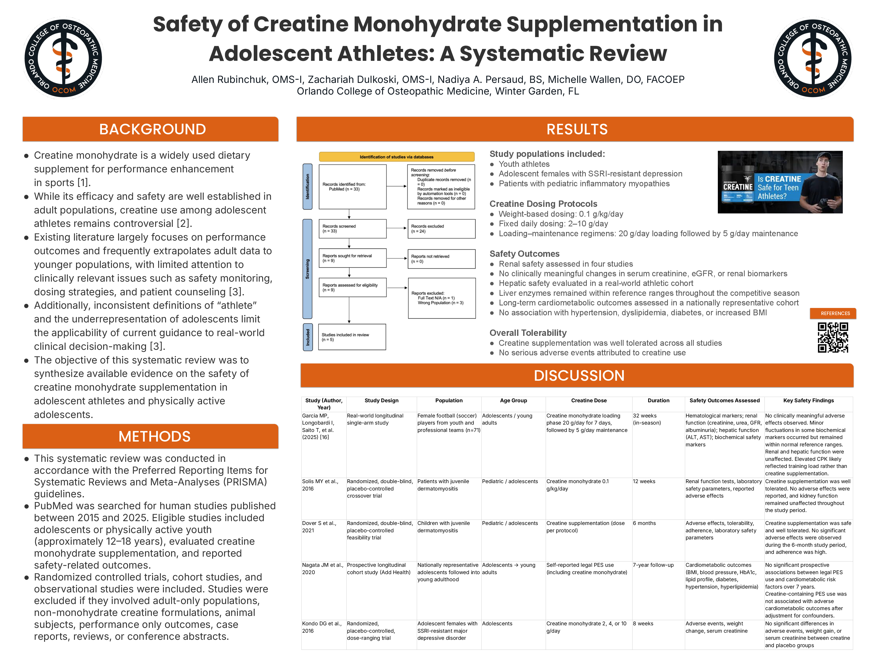 Creatine monohydrate is a widely used dietary supplement for performance enhancement in sports [1]. Although its efficacy and safety are well established in adults, creatine use among adolescents remains controversial [2]. Existing literature often extrapolates adult data to younger populations and prioritizes performance outcomes, with limited emphasis on safety monitoring, dosing strategies, and patient counseling [3]. Inconsistent definitions of “athlete” and limited adolescent representation further restrict clinical applicability [3]. This systematic review aimed to evaluate the safety of creatine monohydrate supplementation in adolescent athletes and physically active youth.
