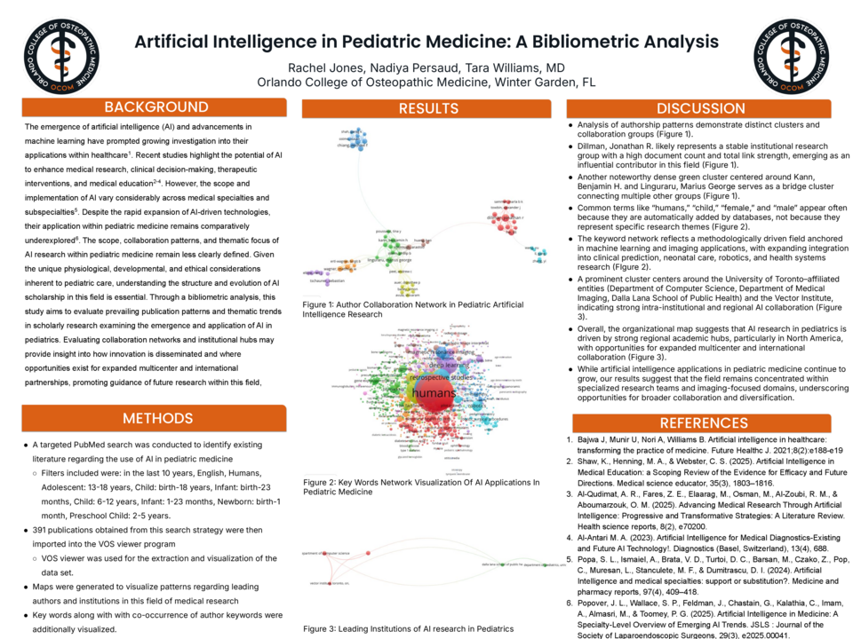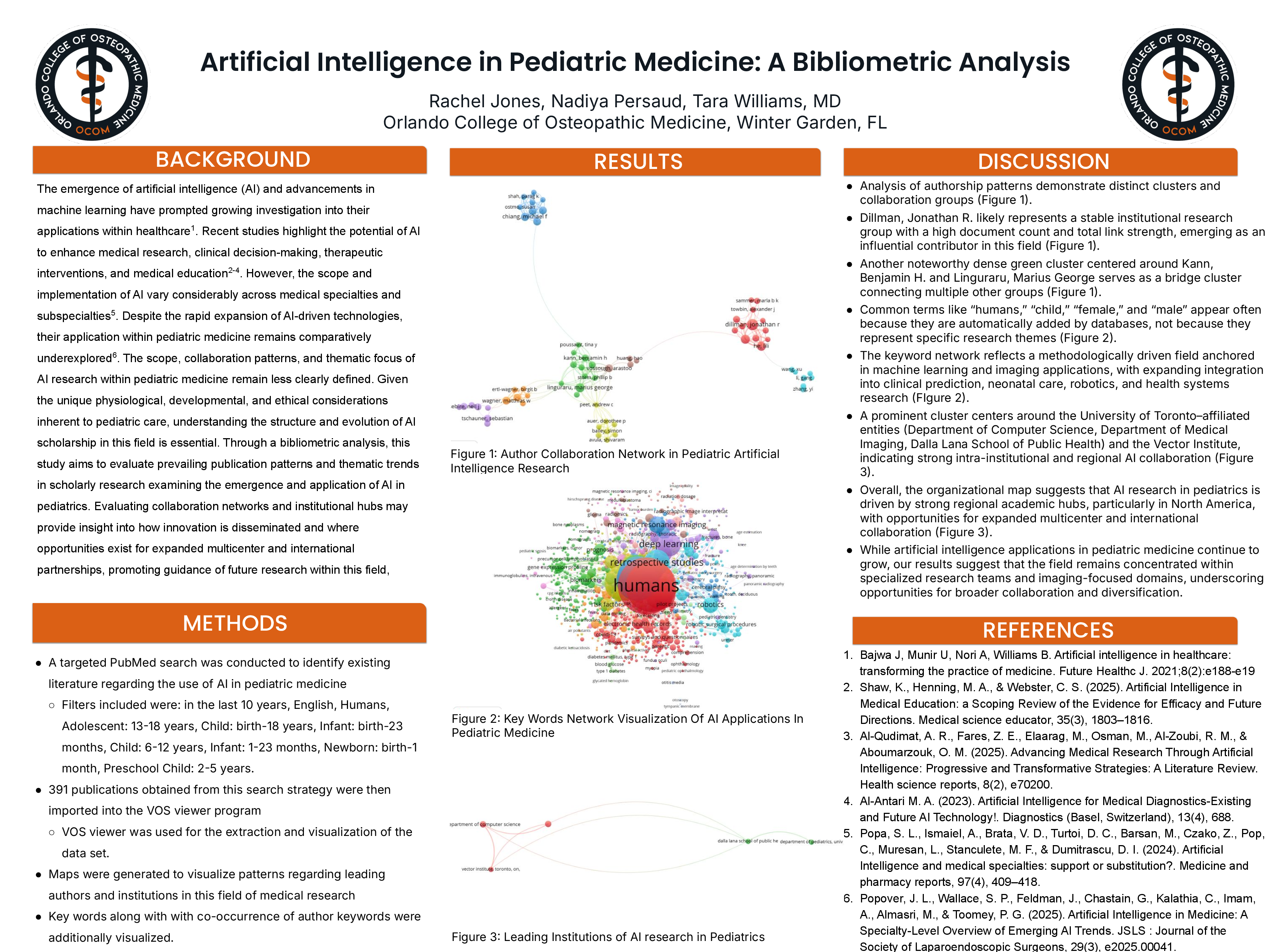Results: Bibliometric mapping demonstrated that artificial intelligence research in pediatric medicine is increasing in volume, but remains distributed within discrete and specialized research clusters.The co-authorship network reveals several distinct collaboration groups rather than a single, highly integrated global network. Lastly, AI research in pediatrics appears to be driven by concentrated academic hubs with limited cross-institutional and international collaboration. Keyword analysis demonstrated a field centered on machine learning and imaging applications, with emerging integration into clinical prediction, neonatal care, robotics, and health systems research.