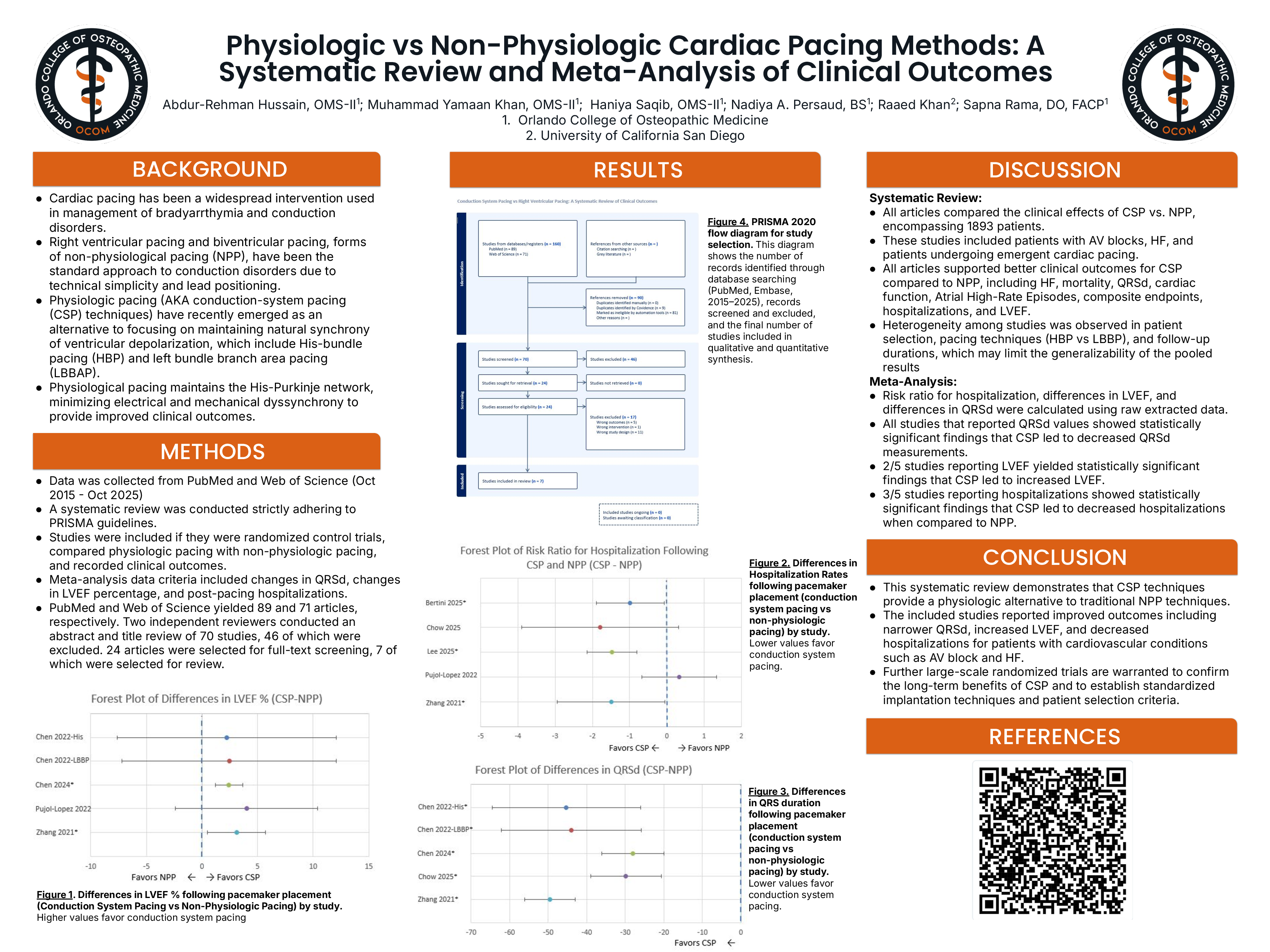 This systematic review and meta analysis aims to compare clinical outcomes in physiologic and non-physiologic pacing methods, emphasizing changes in QRSd, LVEF, and post-pacing hospitalizations.
