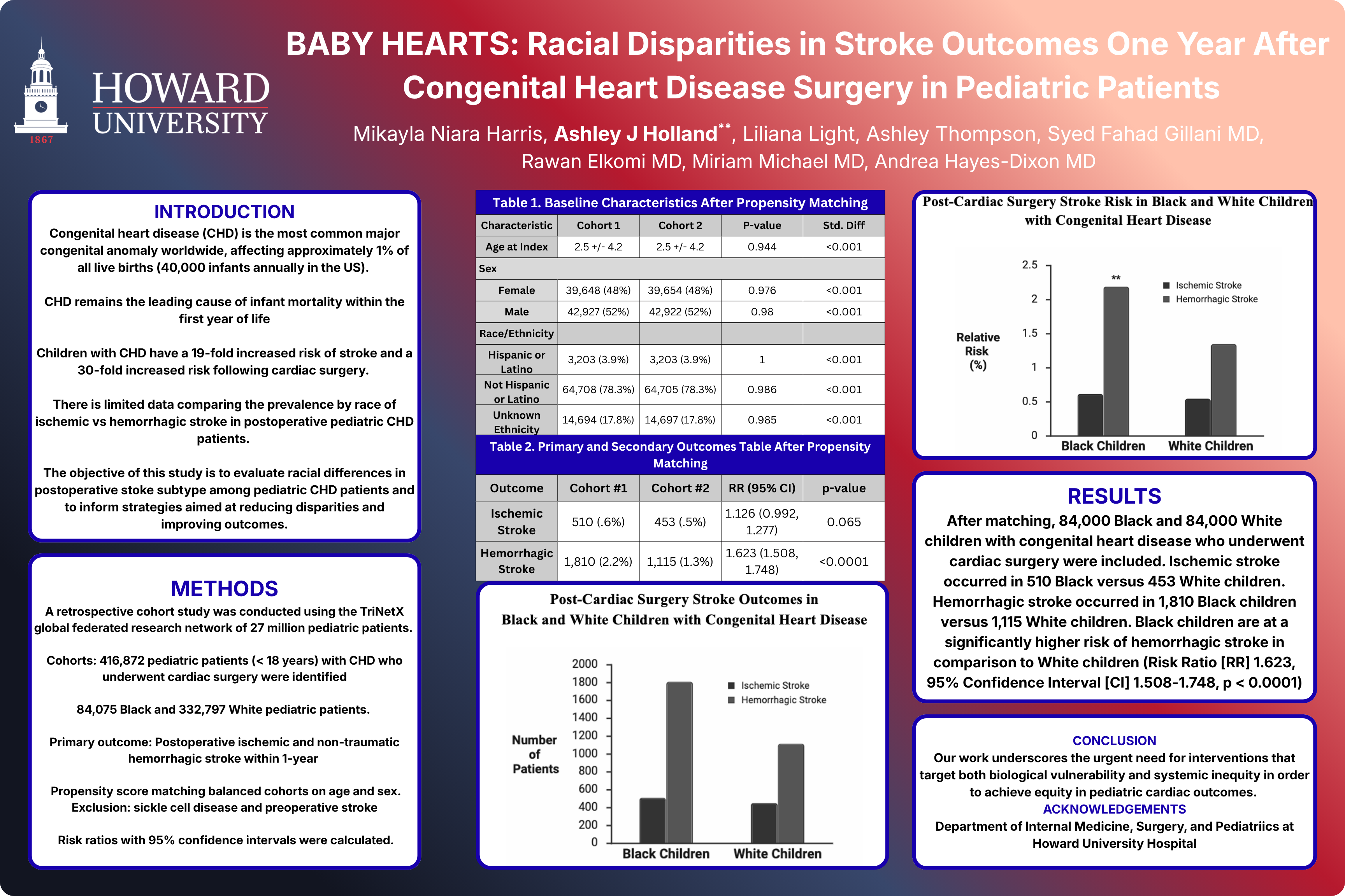 Methods: A retrospective cohort study was conducted using the TriNetX global federated research network of 27 million pediatric patients. A total of 416,872 pediatric patients (< 18 years) with a diagnosis of congenital heart disease who underwent cardiac surgery were identified; of this population there were 84,075 Black and 332,797 White pediatric patients. Postoperative ischemic and non-traumatic hemorrhagic stroke within one year was the primary outcome. Propensity score matching balanced cohorts on age, sex, comorbidities (hypertension, arrhythmia, coagulopathy), surgical complexity, socioeconomic proxies, and other postoperative risk factors. Patients with a sickle cell disease diagnosis and preoperative stroke were not included in this study. Risk ratios with 95% confidence intervals were calculated.