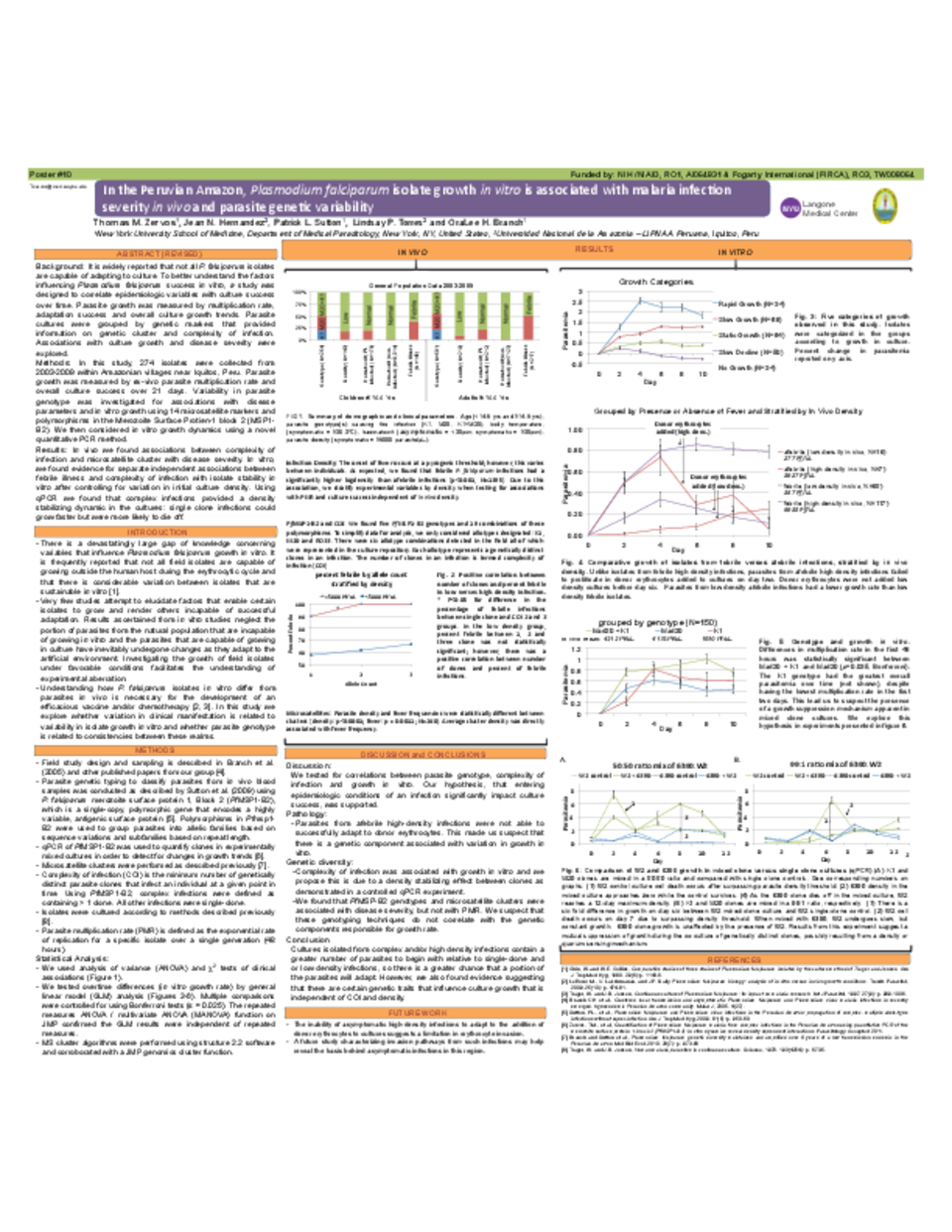 Methods: In this study, 274 isolates were collected from 2003-2009 within Amazonian villages near Iquitos, Peru. Parasite growth was measured by ex-vivo parasite multiplication rate and overall culture success over 21 days. Variability in parasite genotype was investigated for associations with disease parameters and in vitro growth using 14 microsatellite markers and polymorphisms in the Merozoite Surface Protien-1 block 2 (MSP1-B2). We then considered in vitro growth dynamics using a novel quantitative PCR method.