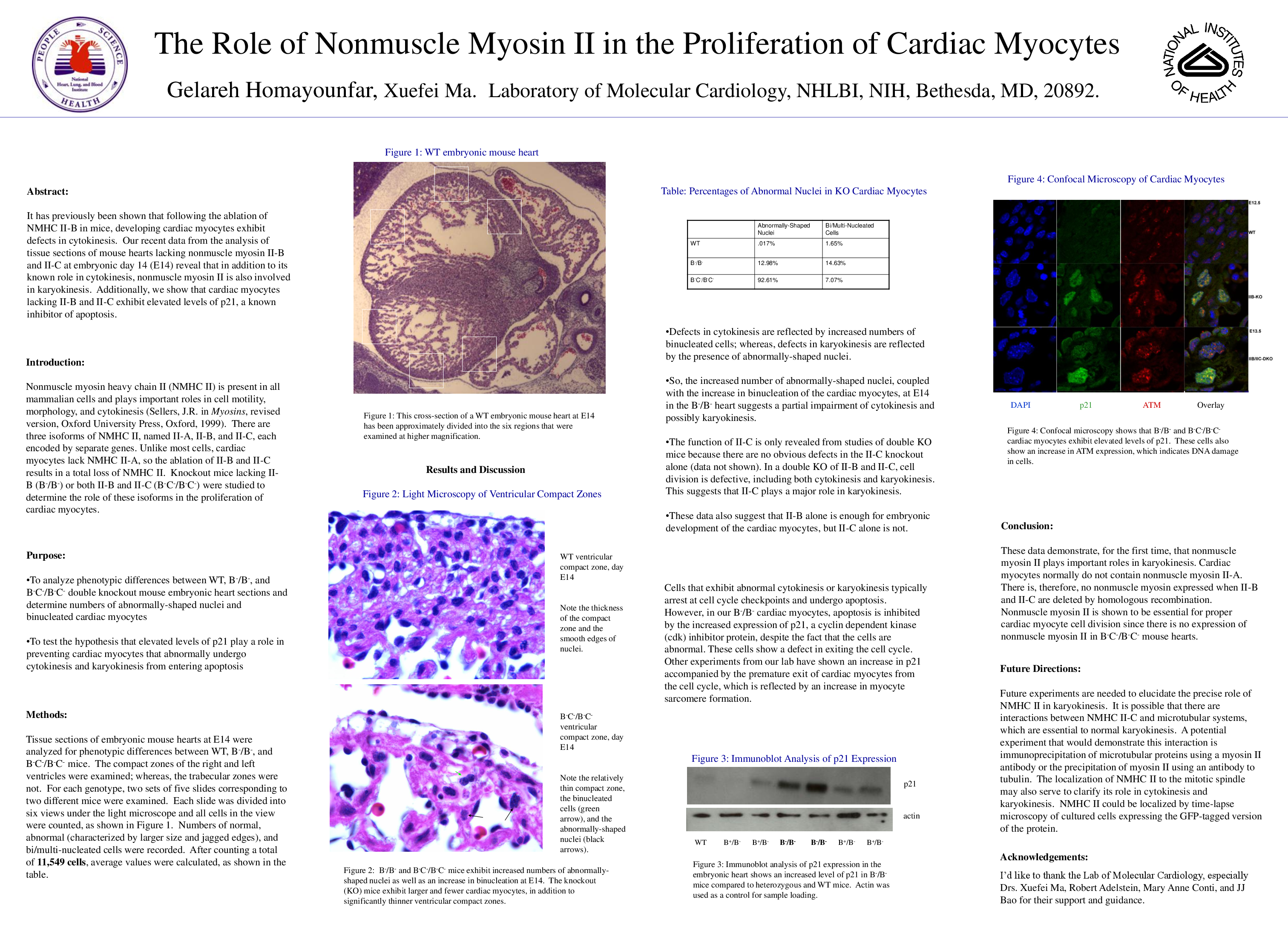 It has previously been shown that following the ablation of nonmuscle myosin heavy chain II (NMHC II), developing cardiac myocytes exhibit defects in cytokinesis. Our recent data from the analysis of tissue sections of mouse hearts lacking nonmuscle myosin II-B and II-C at embryonic day 14 (E14) reveal that in addition to its known role in cytokinesis, nonmuscle myosin II is also involved in karyokinesis. Additionally, we show that cardiac myocytes lacking II-B and II-C exhibit elevated levels of p21, a known inhibitor of apoptosis.