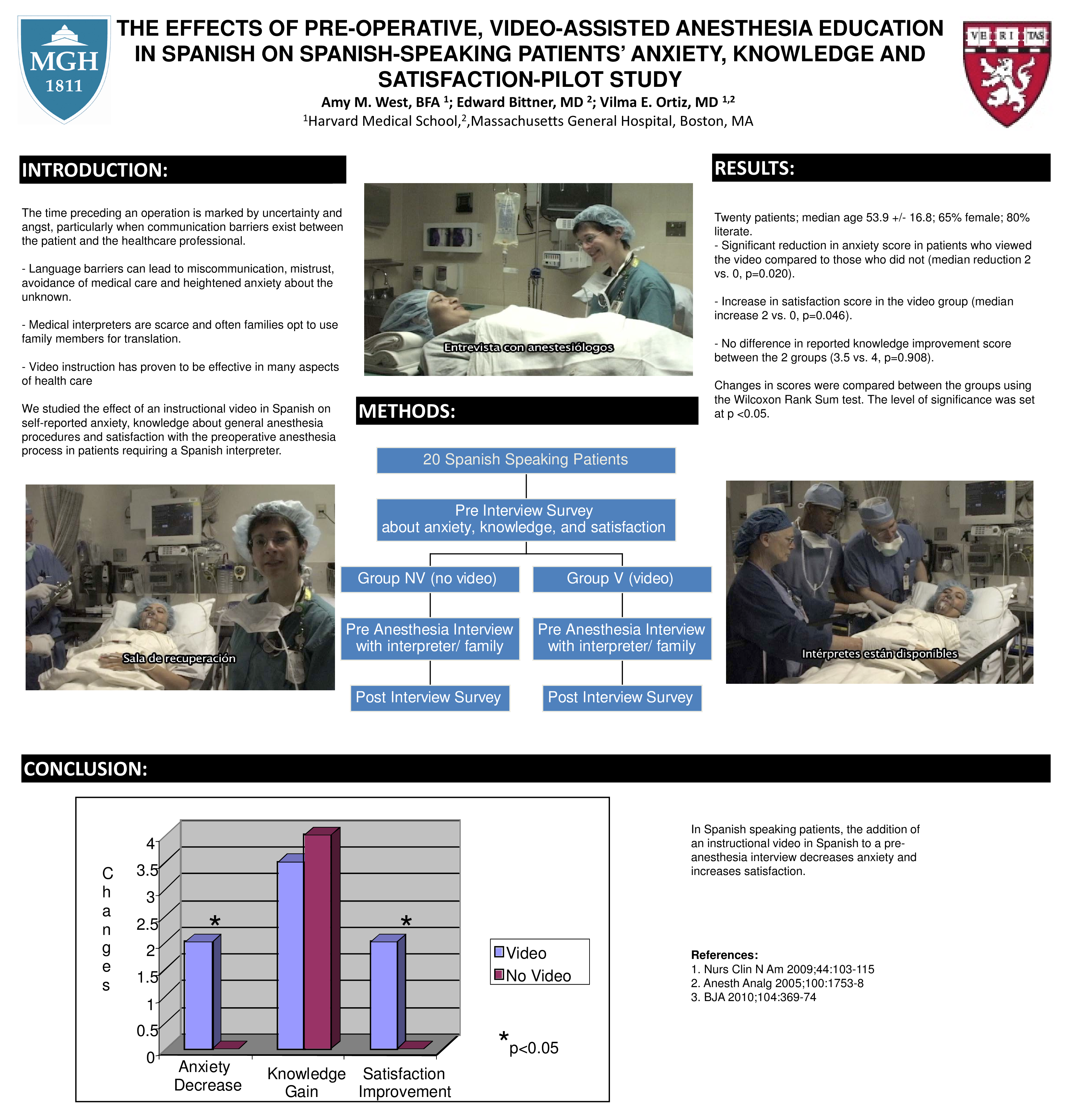 As the portion of the United States’ population with limited English proficiency (LEP) continues to expand, physicians are faced with the challenge of communicating and obtaining informed consent in a language they neither speak nor understand. Technological advances make it possible to bridge the language gap, at least partially, with video modality. We studied the effect of an instructional video in Spanish on self-reported anxiety, knowledge about general anesthesia procedures and satisfaction with the preoperative anesthesia process in patients requiring a Spanish interpreter.