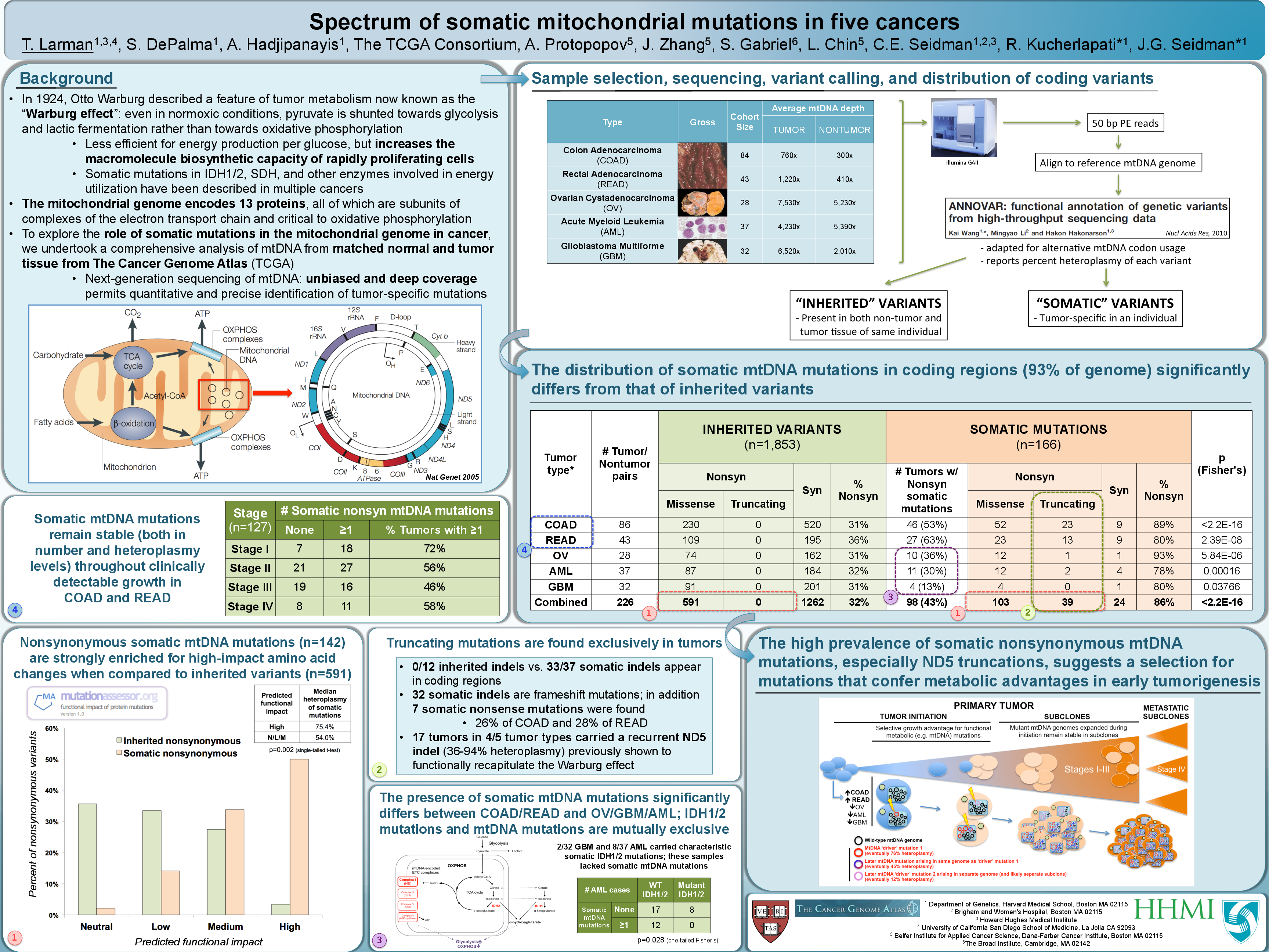 Somatic mitochondrial DNA mutations have been reported in some human tumors, but their spectrum in different malignancies and their role in cancer development remain incompletely understood. Here we describe the breadth of somatic and inherited mutations across the mitochondrial genome by sequence analyses of paired tumor and normal tissue samples from 226 individuals with five types of cancer using whole-genome data generated by The Cancer Genome Atlas Research Network. The frequencies of deleterious tumor-specific somatic mutations found in mtDNA varied across tumor types, ranging from 13% of glioblastomas to 63% of rectal adenocarcinomas. Compared with inherited mtDNA variants, somatic mtDNA mutations were enriched for nonsynonymous vs. synonymous changes (93 vs. 15; P < 2.2Eā16) and were predicted to functionally impact the encoded protein. Somatic missense mutations in tumors were distributed uniformly among the mitochondrial protein genes, but 65% of somatic truncating mutations occurred in NADH dehydrogenase 5. Analysis of staging data in colon and rectal cancers revealed that the frequency of damaging mitochondrial mutations is the same in stages I and IV tumors. In summary, these data suggest that damaging somatic mtDNA mutations occur frequently (13ā63%) in these five tumor types and likely confer a selective advantage in oncogenesis.