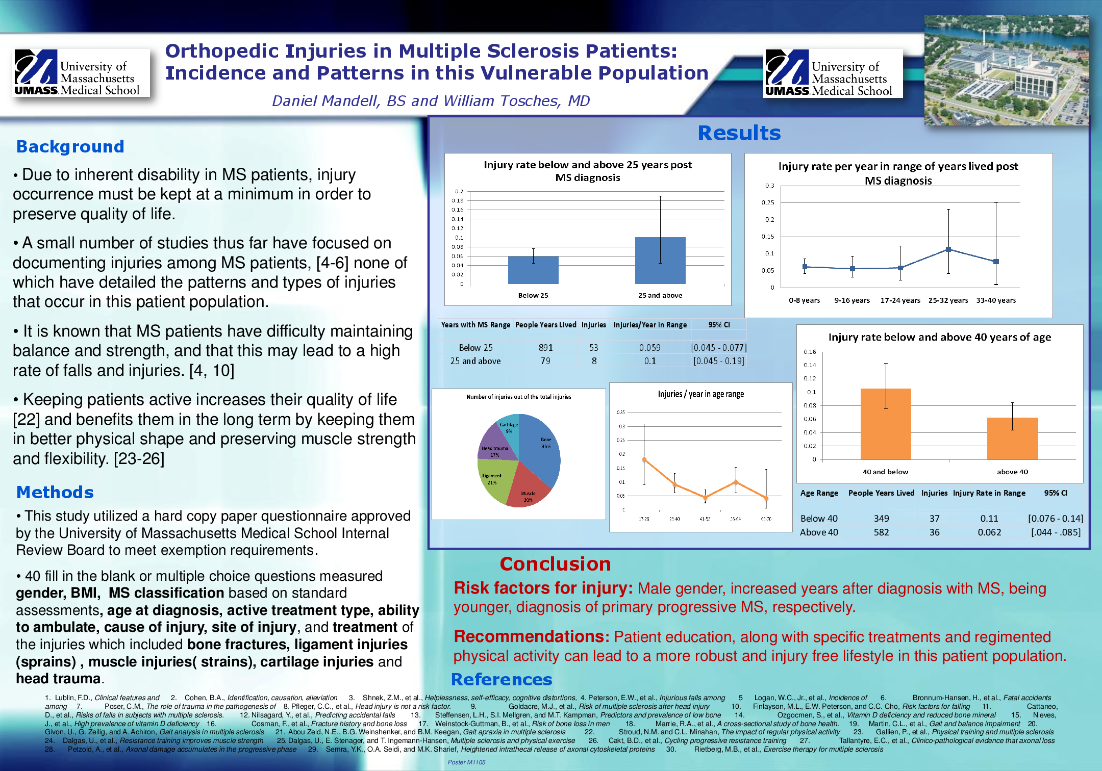 BACKGROUND: Because of the high degree of disability in multiple sclerosis (MS) patients, minimizing injury occurrence is essential for preserving quality of life. OBJECTIVES: By documenting the incidence of particular injuries, establishing relative risks of particular injuries in different subsets of MS patients and analyzing when the injuries occurred following diagnosis, we aim to provide information to encourage injury prevention recommendations and to provide preliminary data for further clinical research. METHODS: This study utilized a questionnaire consisting of 40 fill in the blank or multiple choice questions. It was administered to previously diagnosed MS patients at office visits, infusion center visits, hospital stays, MS clinic visits and MS support groups. RESULTS: The years following definite MS diagnosis with the highest injury rates (injuries/people years lived) were 25 years or more (.0594 injuries/year, 95% CI [0.0771 - 0.0449]). In addition, people below the age of 40 have nearly a doubled risk of injury compared to people above the age of 40 (p= .0331). Primary progressive MS patients had the greatest past incidence of fractures, 55.6% (5/9) (FFH p=0.033). Patients reported that only 17.4% (19/109) of injuries occurred during exercise. CONCLUSIONS: Overall, risk factors for injury include male gender, living longer with MS, being younger and having the diagnosis of primary progressive MS, respectively. Patient education, along with specific treatments and regimented physical activity can lead to a more robust and injury free lifestyle in this patient population.
