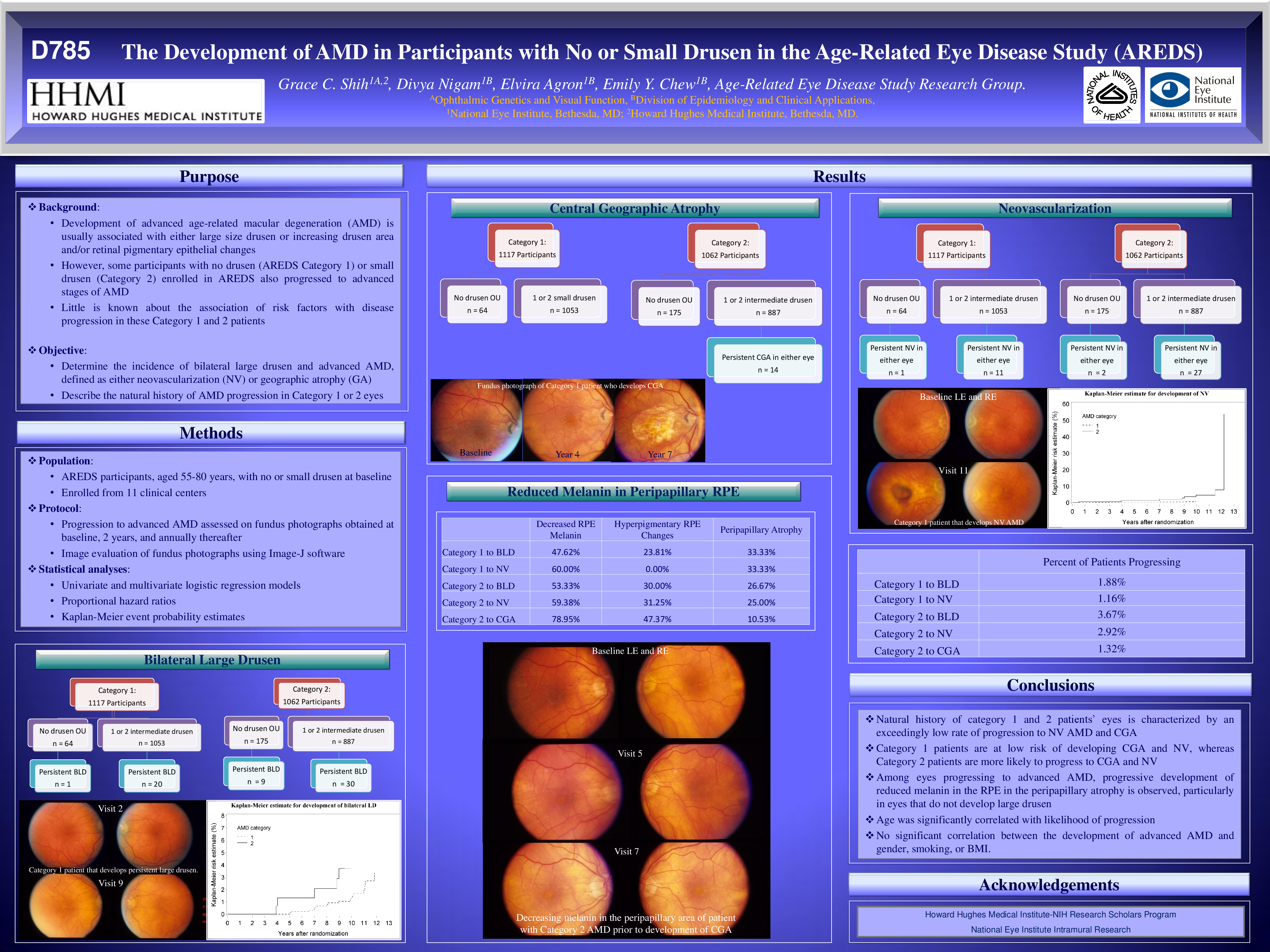 Results: Of the 1117 AREDS participants with no drusen (category 1) and 1062 with small drusen (category 2),69 (6.1%) and 238 (22.4%) developed persistent large drusen in either eye, respectively, over 10 years of follow-up. 1.07% of category 1 patients and 2.73% of category 2 patients progressed to persistent NV. No category 1 patients developed CGA, while 1.22% of category 2 patients progressed to CGA over 10 years. 30.4% of category 1 patients and 20% of category 2 patients progressing to end-stage AMD exhibited peripapillary atrophy. 17.4% category 1 and 40% category 2 end-stage AMD patients demonstrated hyperpigmentary changes. No significant correlation was found between the development of advanced AMD and gender, smoking, or BMI. However, age was significantly correlated with likelihood of progression.