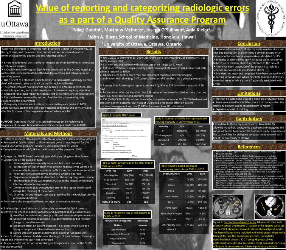 Conclusion: QUIP continues to be used to improve patient care and the number of reported QUIPs has more than doubled since 2009. Although the distribution of types of errors was similar, there has been better response from radiologists to QUIPs this year.
