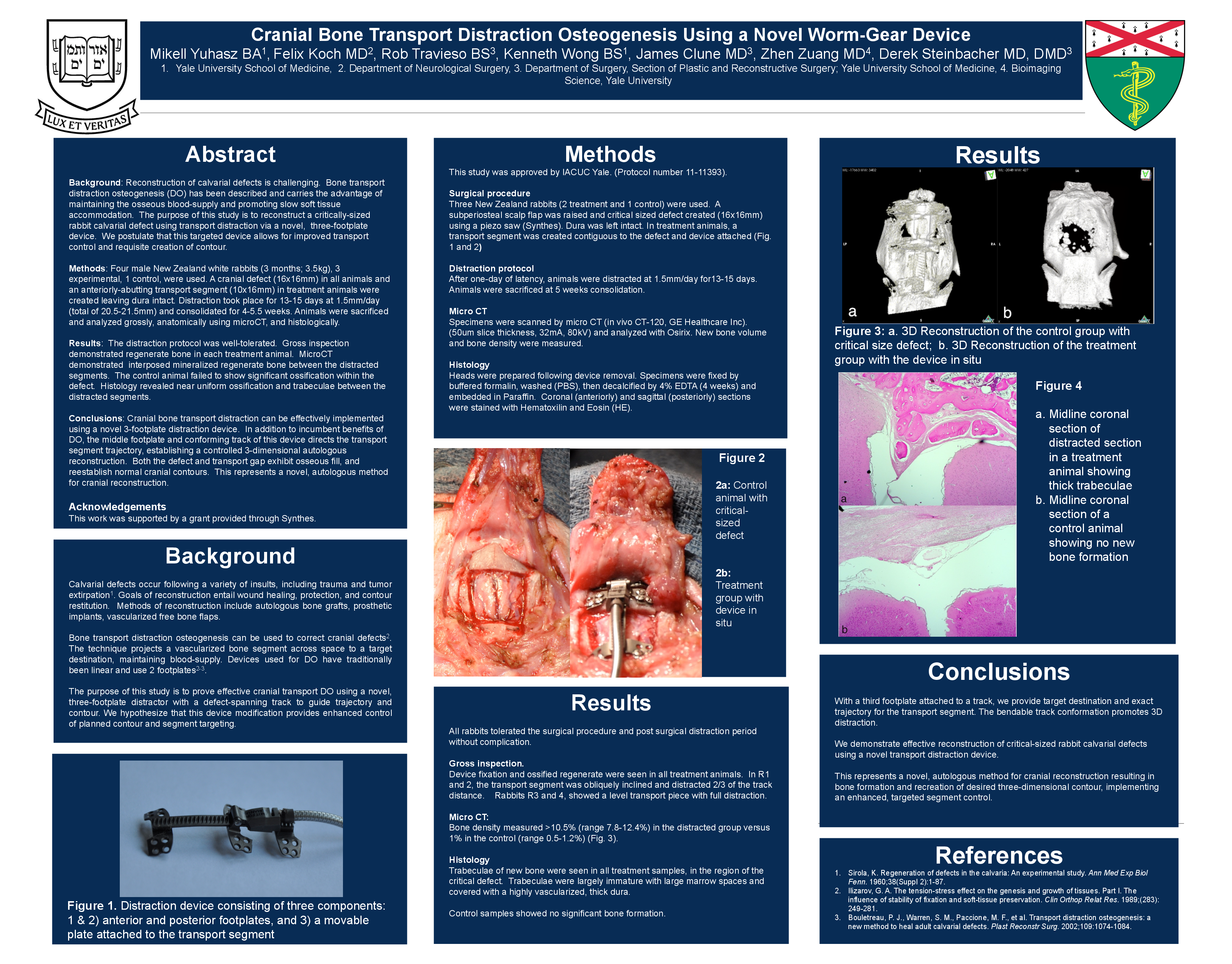 Calvarial defects occur following a variety of insults, including trauma and tumor extirpation, and can be challenging to reconstruct. Bone transport distraction osteogenesis (DO) is a technique that allows for adequate soft tissue expansion and maintains vascularity. The purpose of this study is to reconstruct critically-sized rabbit calvarial defects using transport DO via a novel, three-footplate, worm gear device. We postulate that this device allows for targeted, exact transport segment trajectory and requisite restitution of cranial contour. This study was approved by the Yale University IACUC (11393). Four male New Zealand white rabbits (3 months; 3.5kg), 3 experimental, 1 control, were used. A cranial defect (16x16mm) in all animals along with an anteriorly-abutting transport segment (10x16mm) in treatment animals. Distraction took place for 13-15 days at 1.5mm/day (total of 20.5-21.5mm) and consolidated for 4-5.5 weeks. The animals were sacrificed and analyzed grossly, anatomically using microCT, and histologically. The procedure was well tolerated. Gross inspection demonstrated regenerate bone in each treatment animal. Natural cranial contour was achieved with histology demonstrating near uniform osteoid and trabeculae between segments in the distraction groups. The control animals showed no significant ossification. Micro-CT demonstrated interposed mineralized regenerate bone between the distracted segments in both treatment groups. Bone density measured >10.5% (range 7.8-12.4%) in the distracted group versus 1% in the control (range 0.5-1.2%). We demonstrate effective reconstruction of critical-sized rabbit calvarial defects using a novel transport distraction device, which enhanced targeted segment control and restitution of three-dimensional contour.
