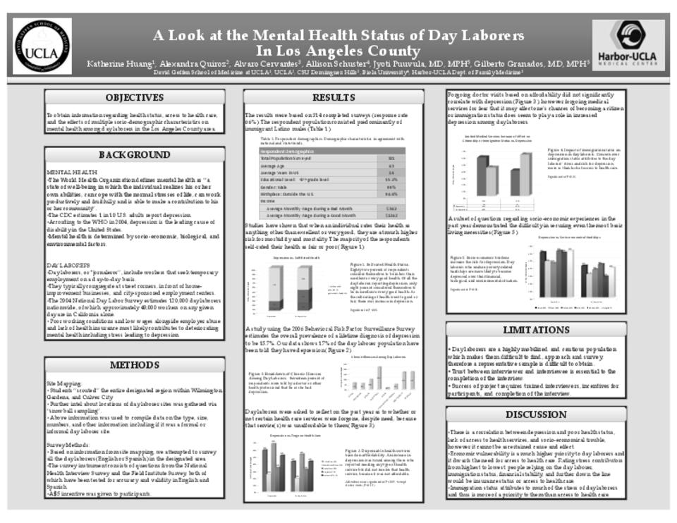 BACKGROUND: Day laborers, people seeking temporary employment on a day-to-day basis, amount to some 120,000 people nationwide. According to the National Day Laborer Survey about 40,000 day laborers look for jobs daily in California alone. The nature of a day laborer leaves this population very vulnerable, further compounded by the fact that a majority are undocumented and do not have health insurance. The World Health Organization (WHO) recognizes that “poor mental health is strongly related to other health conditions…including lower educational achievements, substance abuse, violence, and poor reproductive and sexual health” and ultimately impacts the ability of an individual to contribute to his or her community. Rates of depression among day laborers were obtained as part of a health needs assessment as we surveyed day laborers in the South Bay of Los Angeles County to learn more about day laborers’ health status, access to health care, and attitudes toward healthcare services.