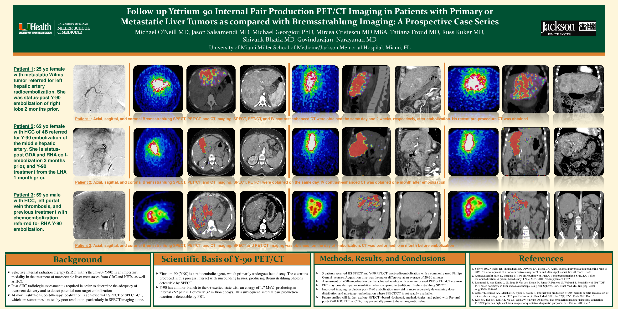 Conclusions: Pair production Yttrium-90 PET/CT is a practical and highly accurate method to confirm anatomic dose distribution of Y-90 in the setting of hepatic tumors. It may be a viable alternative Brehmsstrahlung imaging alone, and it has been suggested to more accurately depict dose distribution than even SPECT/CT. Therefore, we anticipate that it may in fact ultimately emerge as an equivalent modality to SPECT/CT in the post Y-90 treatment setting.