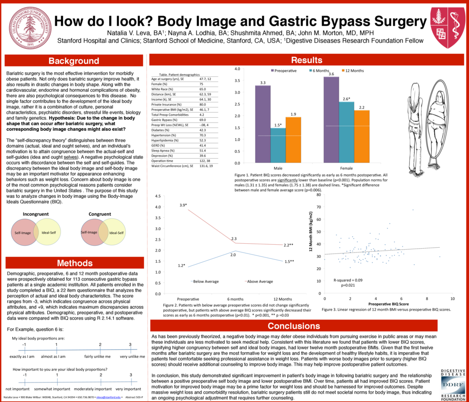 Demographic, preoperative, 6 and 12 month postoperative data were prospectively obtained for 113 consecutive gastric bypass patients at a single academic institution. All patients enrolled in the study completed a BIQ, a 22 item questionnaire that analyzes the perception of actual and ideal body characteristics. The score ranges from -3, which indicates congruence across physical attributes, and +9, which indicates maximum discrepancies across physical attributes. Demographic, preoperative, and postoperative data were compared with BIQ scores using R 2.14.1 software.