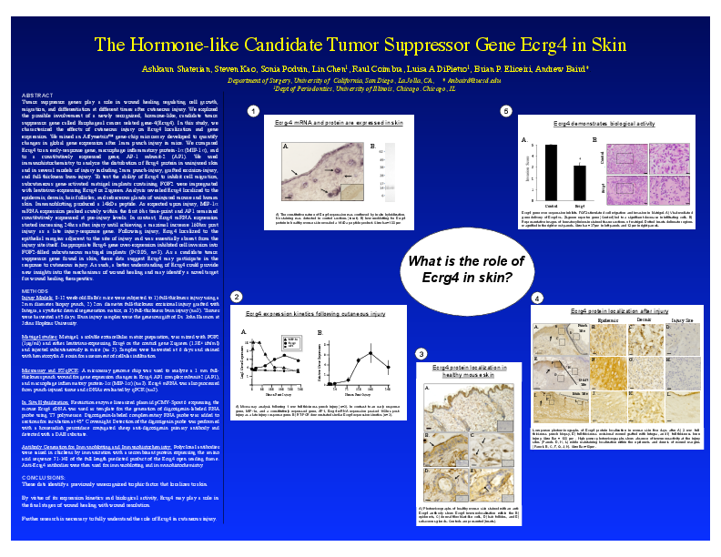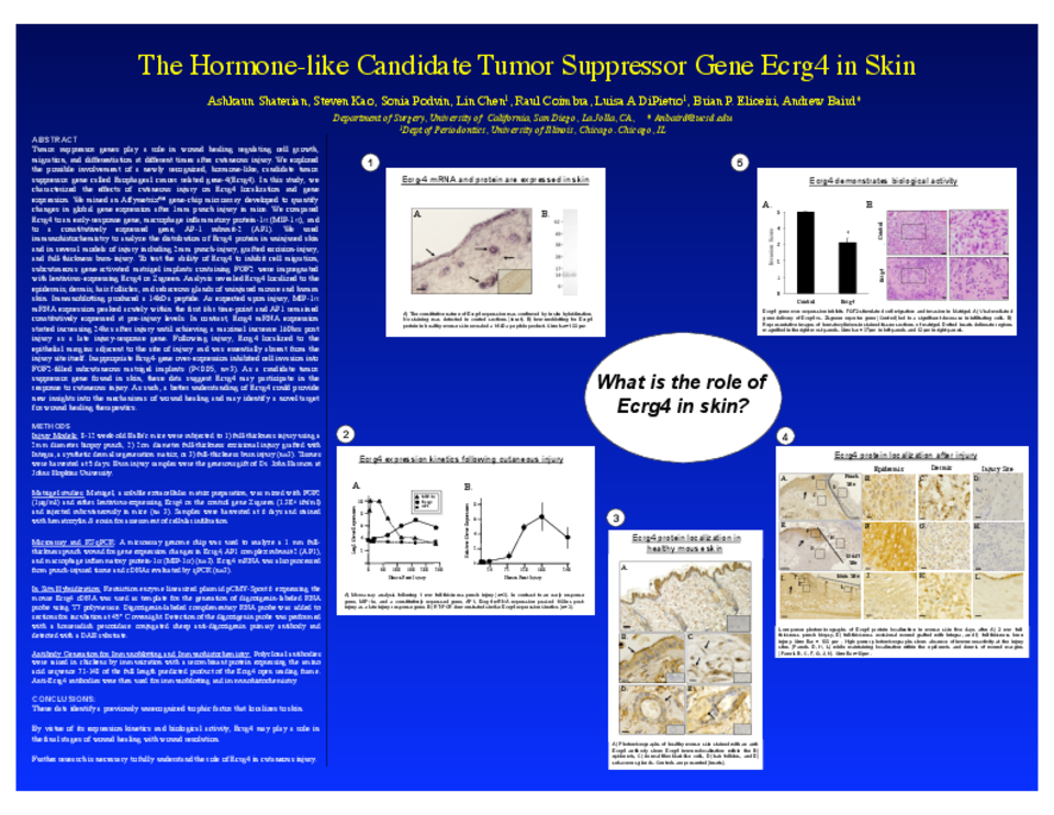 Tumor suppressor genes play a role in wound healing regulating cell growth, migration, and differentiation at different times after cutaneous injury. We explored the possible involvement of a newly recognized, hormone-like, candidate tumor suppressor gene called Esophageal cancer related gene-4(Ecrg4). In this study, we characterized the effects of cutaneous injury on Ecrg4 localization and gene expression. We mined an Affymetrix™ gene-chip microarray developed to quantify changes in global gene expression after 2mm punch injury in mice. We compared Ecrg4 to an early-response gene, macrophage inflammatory protein-1α(MIP-1α), and to a constitutively expressed gene, AP-1,subunit-2 (AP1S2). We used immunohistochemistry to analyze the distribution of Ecrg4 protein in uninjured skin and in several models of injury including 2mm punch-injury, grafted excision-injury, and 2nd-degree burn-injury. To test the ability of Ecrg4 to inhibit cell migration, subcutaneous gene-activated matrigel implants containing FGF2 were impregnated with lentivirus-expressing Ecrg4 or Zsgreen. Analysis revealed Ecrg4 localized to the epidermis and dermis of uninjured mouse and human skin and to the epidermis of rat skin. Immunoblotting produced a 14kDa peptide. As expected upon injury, MIP-1α mRNA expression peaked acutely within the first 6hr time-point and AP1S2 remained constitutively expressed at pre-injury levels. In contrast, Ecrg4 mRNA expression started increasing 24hrs after injury until achieving a maximal increase 160hrs post injury as a late injury-response gene. Following injury, Ecrg4 localized to the epithelial margins adjacent to the site of injury and was essentially absent from the injury site itself. Inappropriate Ecrg4-gene over-expression inhibited cell invasion into FGF2-filled subcutaneous matrigel implants(P<0.05,n=3). As a candidate tumor suppressor gene found in skin, these data suggest Ecrg4 may participate in the response to cutaneous injury as a wound terminating factor that functions to down-regulate the cellular responses active in early wound healing. As such, a better understanding of Ecrg4 could provide new insights into the mechanisms of wound healing and may identify a novel target for wound healing therapeutics.