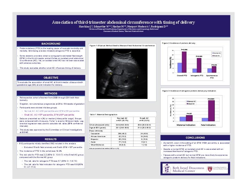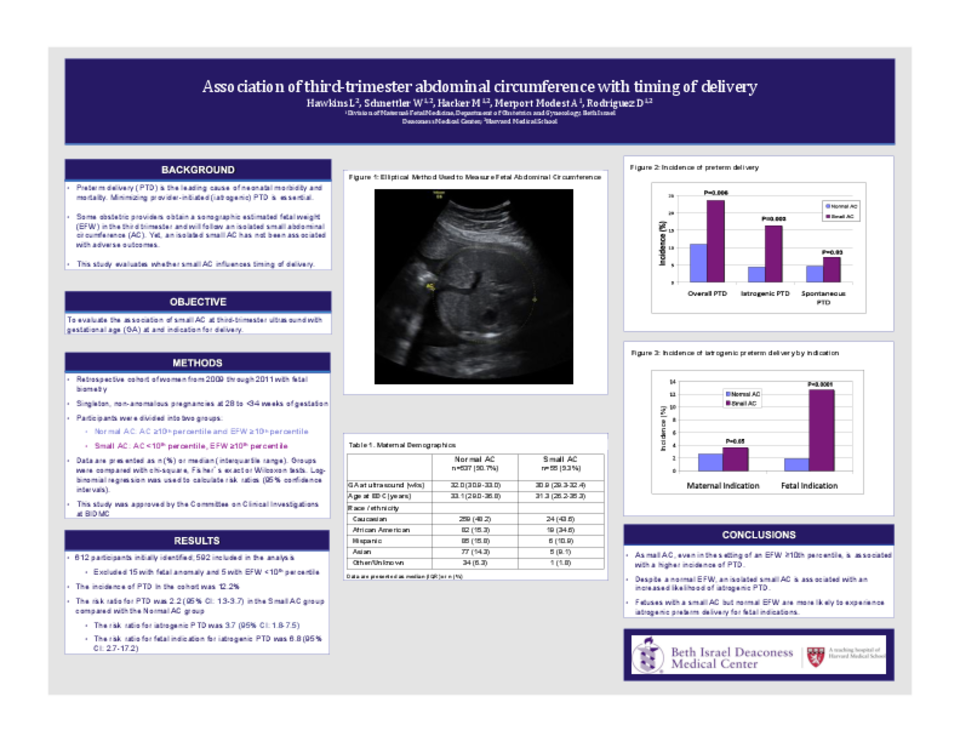 Results: 597 women met eligibility criteria, and demographic data was similar throughout the cohort. The median GA at ultrasound was 32.0 weeks (IQR: 30.6-33.0) and median maternal age at delivery was 32.9 years (IQR: 28.8-36.7). A small AC was found in 10.6% of the fetuses. The incidence of pre-term delivery (PTD) in the cohort was 12.2%.
