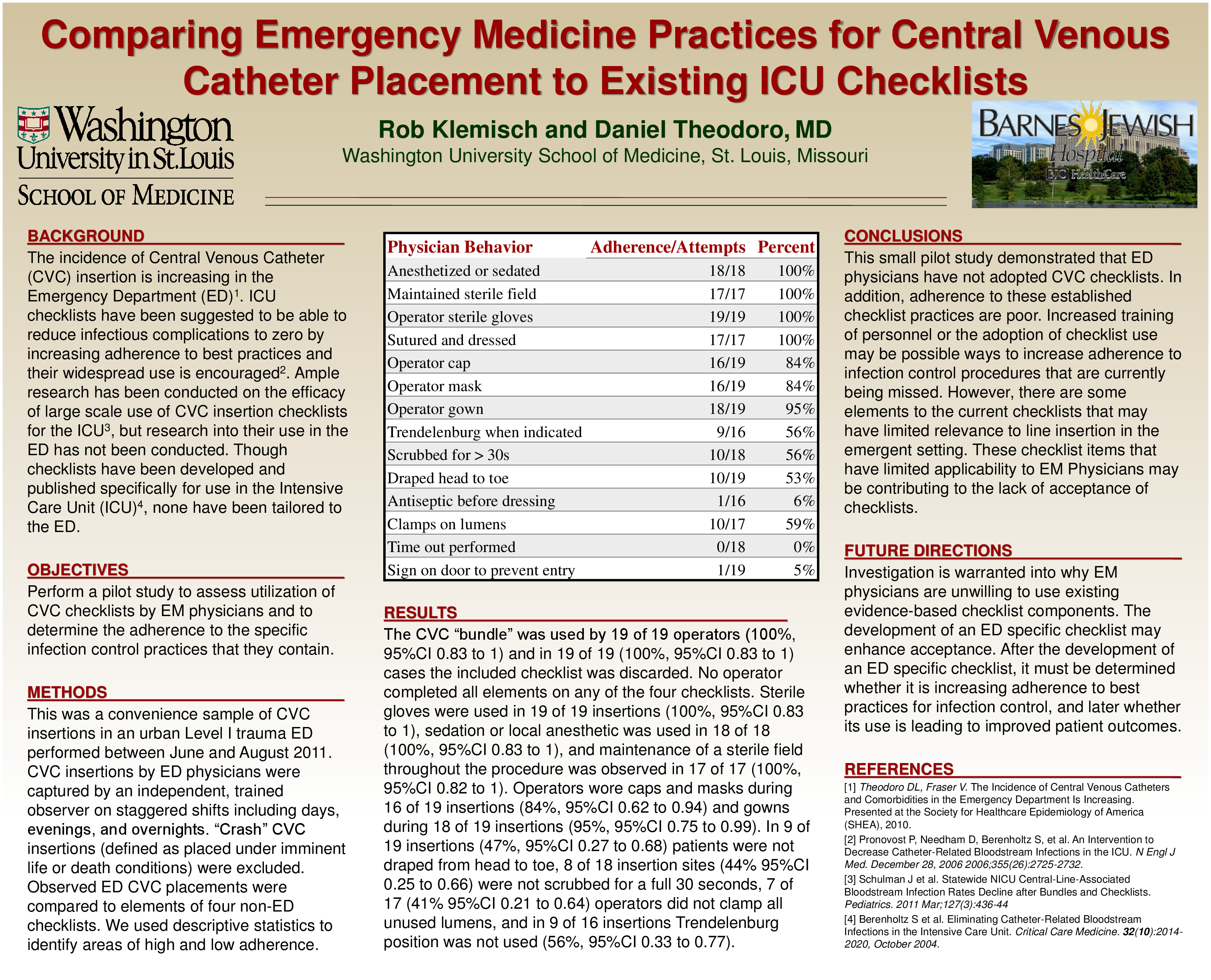 Perform a pilot study to assess ED utilization of well accepted CVC checklists and determine adherence to specific checklist elements related to infection control.