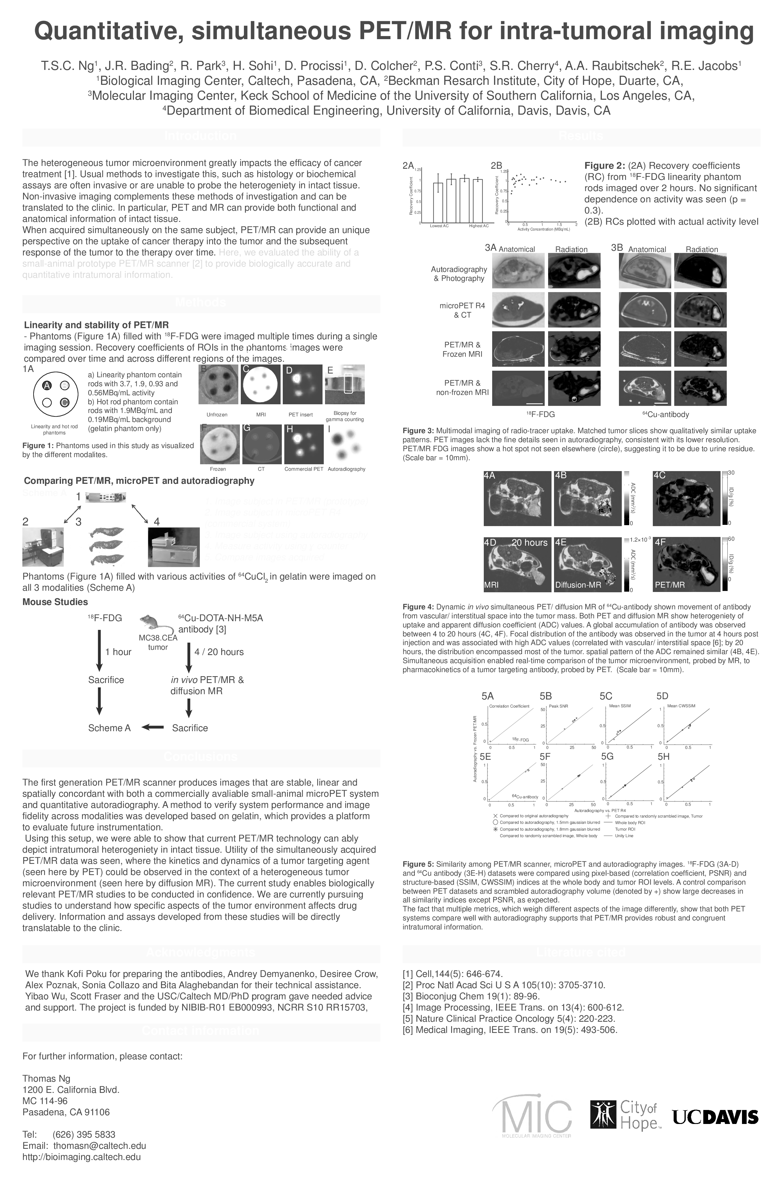 Quantitative imaging characteristics of the MR-compatible PET (“PET/MRI”) scanner were evaluated with phantoms using calibration coefficients derived from a mouse-sized linearity phantom. PET imaging performance was compared to a commercial small-animal PET system (microPET R4) and autoradiography in tumor-bearing mice. Pixel and structure-based similarity metrics were used to evaluate image concordance among modalities. Feasibility of simultaneous PET/MRI functional imaging of tumors was explored by following 64Cu-labeled antibody uptake in relation to diffusion-MRI using co-occurrence matrix analysis.