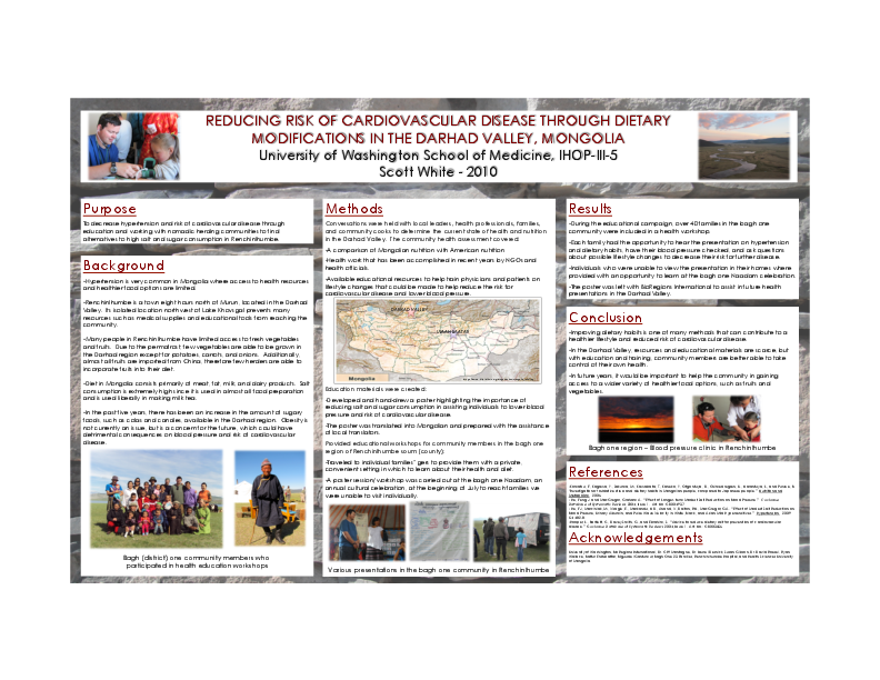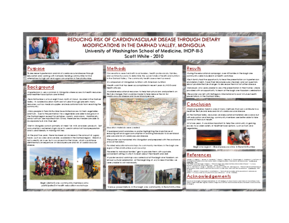 Methods Used: Over four weeks, a health assessment of the nomadic herding communities of the Darhad valley was performed in cooperation with physicians from Renchilhumbe Hospital and BioRegions International. Hypertension and a diet high in salt and animal products with minimal intake of fruits and vegetables were found to be widespread problems. Based on information obtained from the medical literature, an educational poster was created describing the benefits of reducing salt and sugar consumption on cardiovascular health. The poster was utilized during several free workshops, performed inside families’ gers and at annual community cultural events in the bagh (district) one region of Renchinlhumbe.