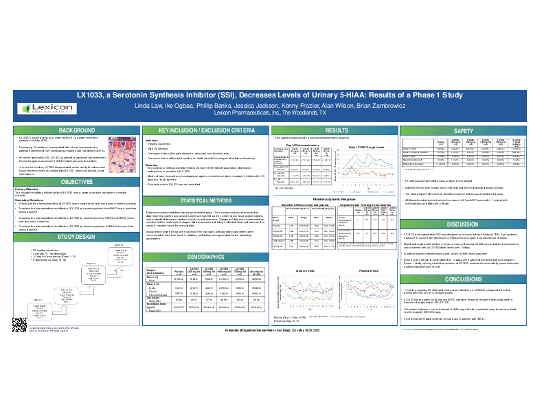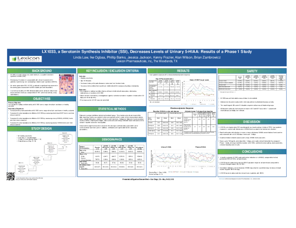 In healthy subjects, LX1033 produced similar reductions in u5-HIAA, compared to the first generation SSI (LX1031), at lower doses. LX1033 has the potential to improve IBS-D symptom response at lower doses compared to Lexicon’s first generation SSI, LX1031. Correlation between urine and plasma 5-HIAA may allow for a potential easy to measure blood marker to guide IBS-D therapy. LX1033 has been advanced into clinical trials in patients with IBS-D.