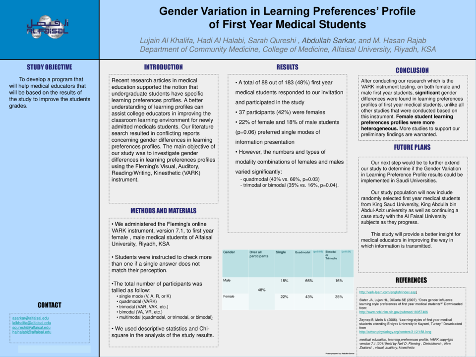 We administered the Fleming’s online VARK instrument, version 7.1, to first year female , male medical students of Alfaisal University, Riyadh, KSA. Students were instructed to check more than one if a single answer does not match their perception. The total number of participants was tallied as follow: single mode (V, A, R, or K), quadmodal (VARK), trimodal (VAR, VAK, etc.), bimodal (VA, VR, etc.), and multimodal (quadmodal, or trimodal, or bimodal). We used descriptive statistics and Chi-square in the analysis of the study results.