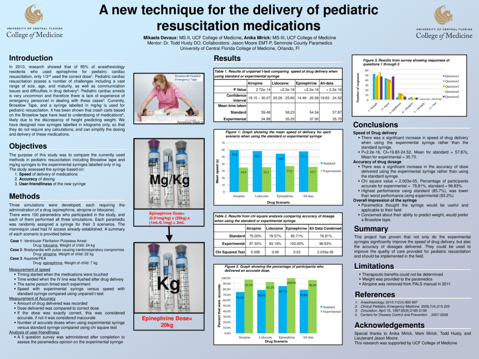 The dosage of pediatric resuscitation drugs is currently calculated using a Broselow tape to estimate weight, and then calculating the amount delivered in (mg/kg)1. The fault with this is the assumption that weight correlates with height. However, with the increasing incidence of obesity in children in the US, the system is becoming inaccurate2. It has been shown that the Broselow tape does not always effectively predict the correct dosage for children and that the complicated calculation has introduced error to the dosage1,3. The drugs used to treat children in cardiac arrest have fairly strict guidelines for delivery and many of them are lethal if given in high doses4. In addition to issues with estimation of weight, the multiple steps with using the Broselow tape and syringes is enough to delay the timely delivery of the drugs. Therefore, an experimental syringe has been designed that is labelled in weight (kg) rather than (mg/kg), in order to bypass calculation steps and to allow more acute dosage delivery. The preliminary testing of these new syringes has shown that there is a significantly shortened time for delivery of drugs when using the experimental design versus the standard syringes currently in use (p< 2.2e-16, Mean = 35.70, CI = 19.83 - 24.52). It was also found that there was a significant increase in the accuracy of amount of drug delivered using the experimental syringe compared to that using the standard syringe (p<0.05). The experimental syringes have the potential to improve both the speed and accuracy at which pediatric resuscitation drugs are delivered to patients in cardiac arrest. The next step is to determine whether these syringes are actually feasible in practice.