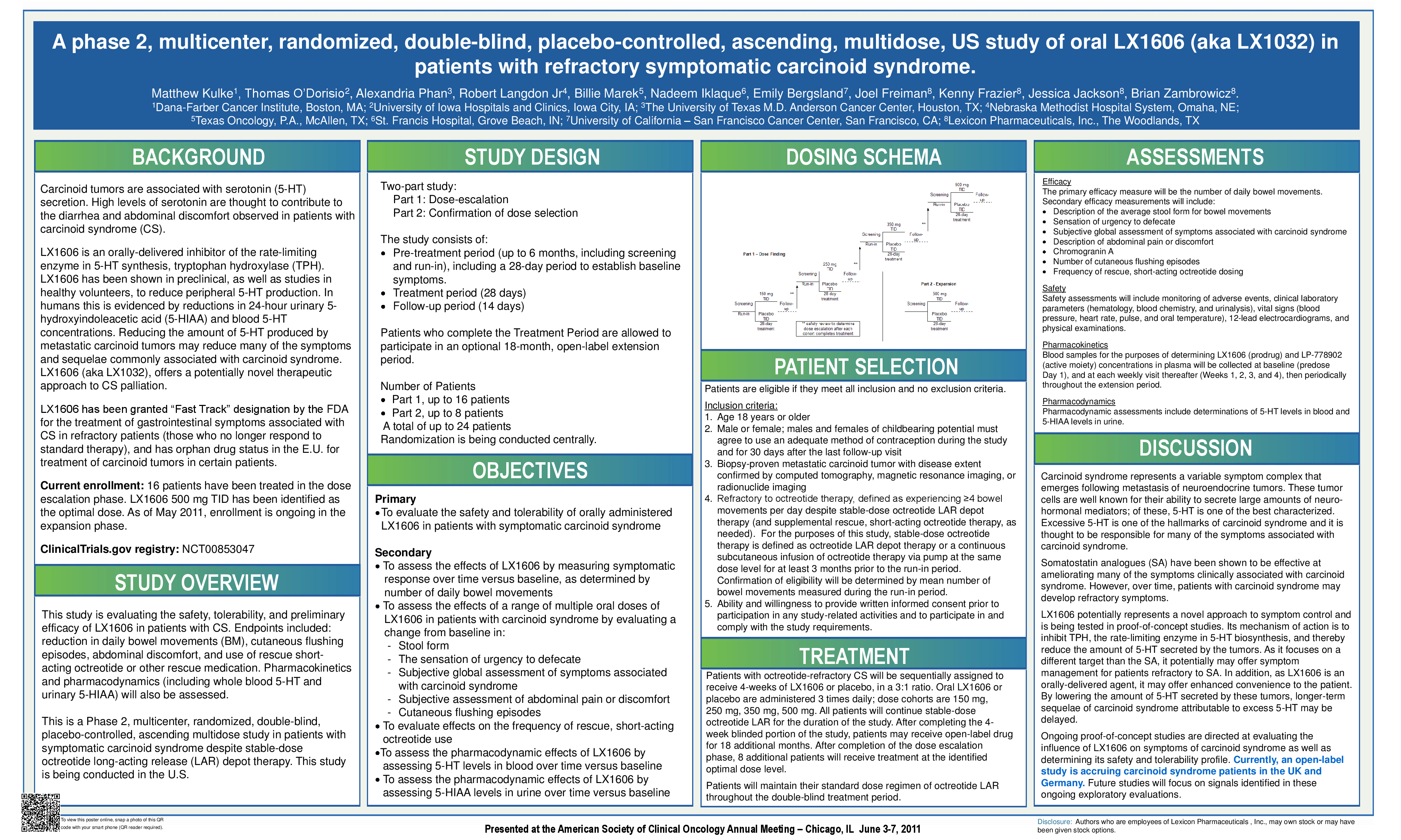 LX1606 is an orally-delivered inhibitor of the rate-limiting enzyme in 5-HT synthesis, tryptophan hydroxylase (TPH). LX1606 has been shown in preclinical, as well as studies in healthy volunteers, to reduce peripheral 5-HT production. In humans this is evidenced by reductions in 24-hour urinary 5-hydroxyindoleacetic acid (5-HIAA) and blood 5-HT concentrations. Reducing the amount of 5-HT produced by metastatic carcinoid tumors may reduce many of the symptoms and sequelae commonly associated with carcinoid syndrome. LX1606 (aka LX1032), offers a potentially novel therapeutic approach to CS palliation.