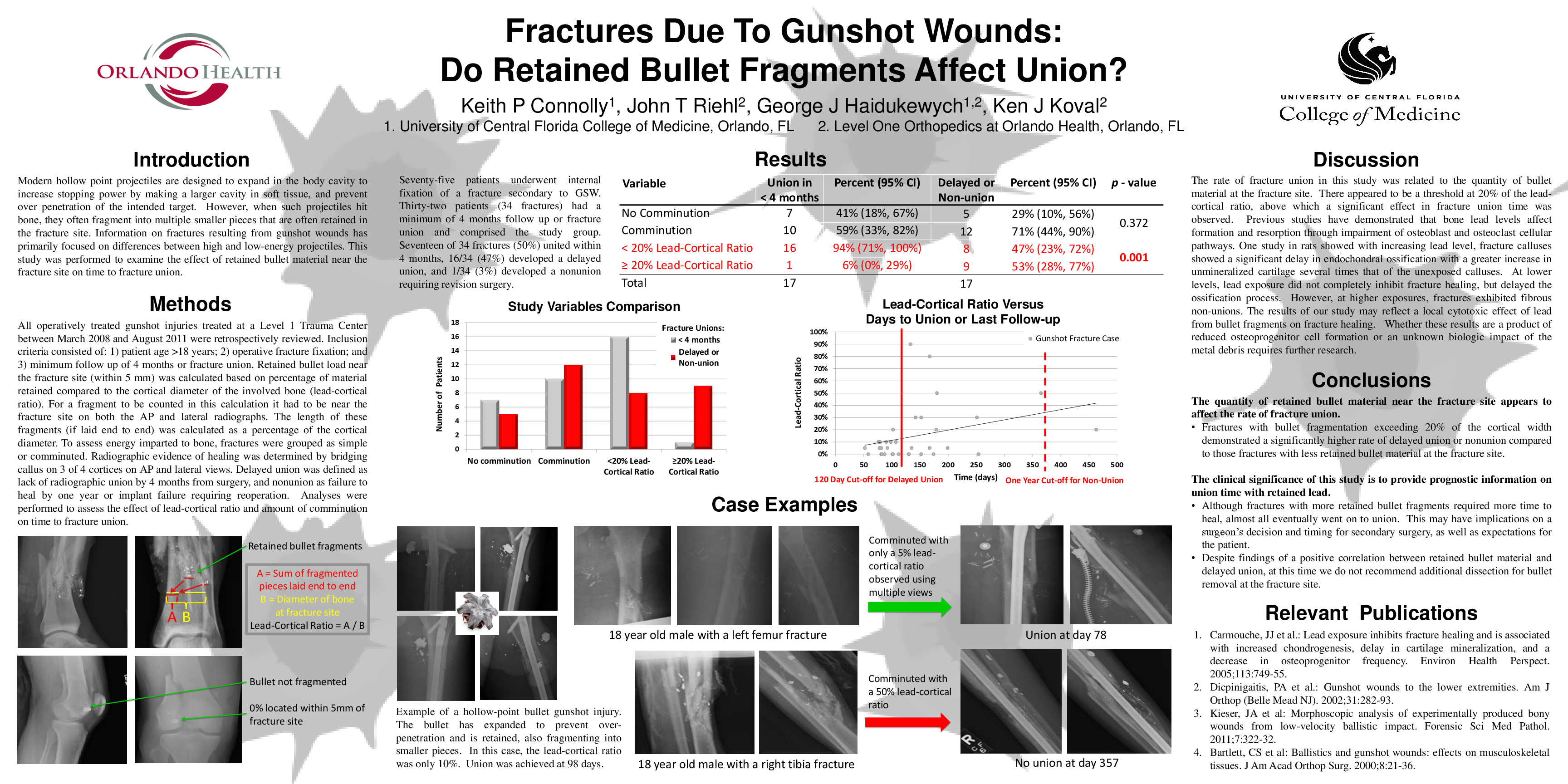 Methods: All operatively treated gunshot injuries treated at a Level 1 Trauma Center between March 2008 and August 2011 were retrospectively reviewed. Retained bullet load near the fracture site was calculated based on percentage of material retained compared to the cortical diameter of the involved bone. Analyses were performed to assess the effect of lead-cortical ratio and amount of osseous comminution on time to fracture union.