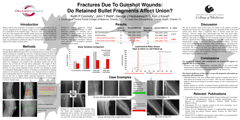 Results: Seventy-five patients underwent internal fixation of a fracture secondary to gunshot wounds; 32 patients (34 fractures) met the inclusion criteria. There were an equal number of comminuted (17) and non-comminuted fractures (17) in the study group. Seventeen of 34 fractures (50%) united within 4 months, 16/34 (47%) developed a delayed union, and 1/34 (3%) developed a nonunion requiring revision surgery. When the cumulative amount of bullet fragmentation retained near the fracture site was less than 20% of the cortical diameter, 16/17 fractures (94%) united by 4 months while only 1/17 (6%) united by 4 months when retained fragments near the fracture site was equal to or exceeding 20% of the cortical diameter (p = 0.001). Fracture comminution had no effect on time to fracture union (p = 0.372).